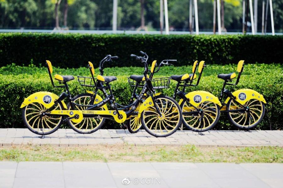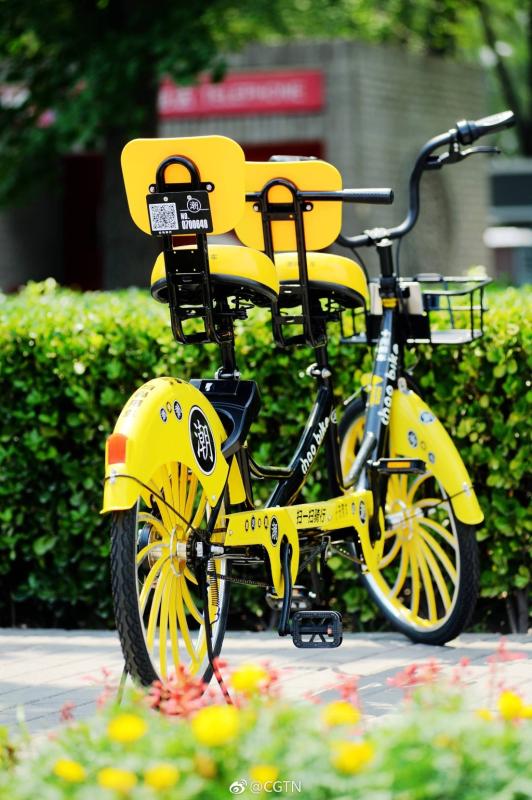 China's bike-sharing scene is embracing a new member to the family as a bunch of tandem bikes hit the Beijing Olympic Park. Costing 10 yuan (about 1.5 U.S. dollars) per ride, the bicycle made for two is reportedly only available in such places as parks, university campuses and at tourists attractions. (Photo/CGTN's Sina Weibo account)