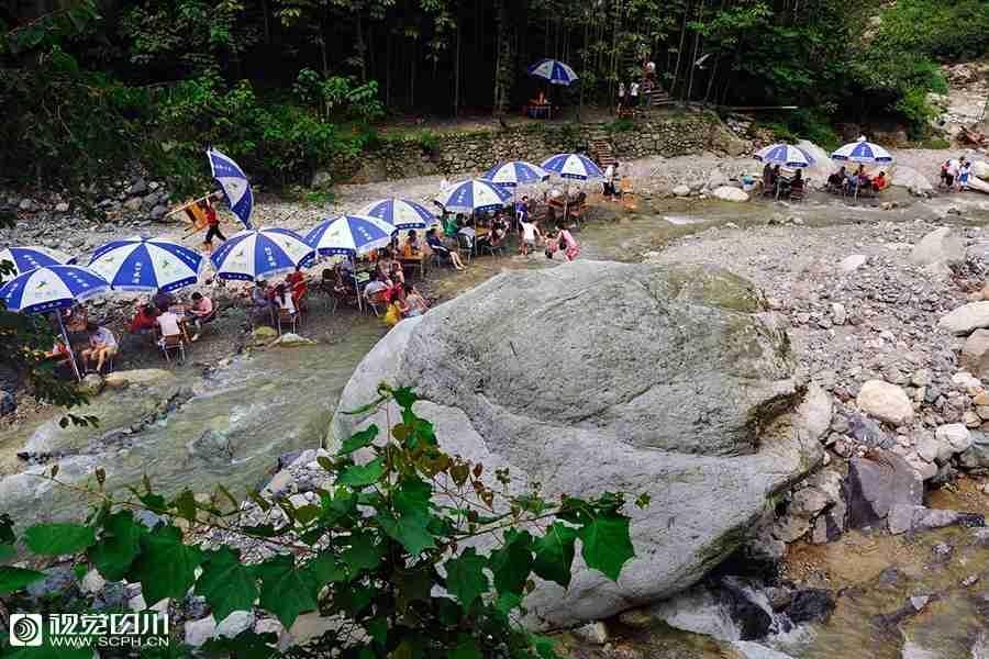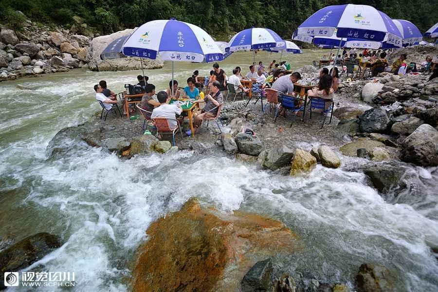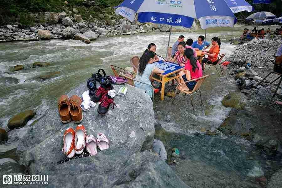 Visitors play mahjong by a river at a scenic spot in Chengdu City, capital of Southwest China’s Sichuan Province, on a sweltering day. Mahjong is perhaps the most popular game in the province, where people can often be found dipping their feet in water on hot days while playing the game. (Photo/scph.cn)
