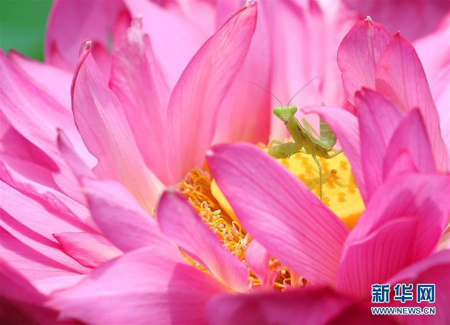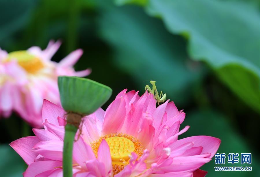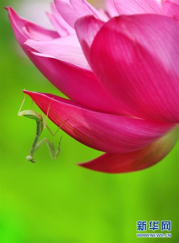 Photos show a green mantis playing on the lotus flowers blooming in Kaishadao, Nantong City, eastern China's Jiangsu Province, on July 13. (Photo/Xinhua)