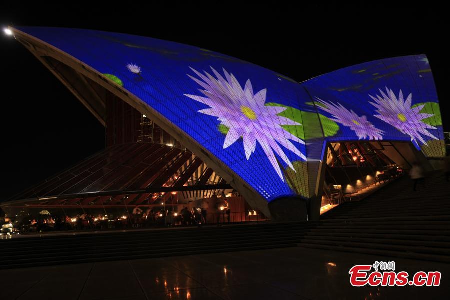 The Sydney Opera House is illuminated in the spectacular seven-minute projection Badu Gili -- meaning "water light" in the language of the traditional owners of Bennelong Point, the Gadigal people, July 12, 2017. It's a new experience that will light the building's famous sails at sunset and 7 p.m. in celebration of the rich history and contemporary vibrancy of Australia's First Nations culture. (Photo: China News Service/Lin Dan)