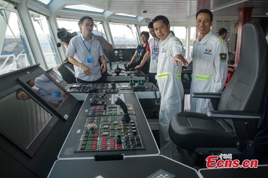 Nanhaijiu 102, China's first vessel capable of conducting rescues in deep, open water, is open for the public visit in Beihai City, South China’s Guangxi Zhuang Autonomous Region, July 14, 2017. An all-weather, high-powered rescue ship designed and built by China, it is 127 meters long and 16 meters wide, with a displacement of 7,300 tons and a range of 16,000 nautical miles. The ship is the most advanced rescue vessel based in the South China Sea. (Photo: China News Service/Zhai Liqiang)