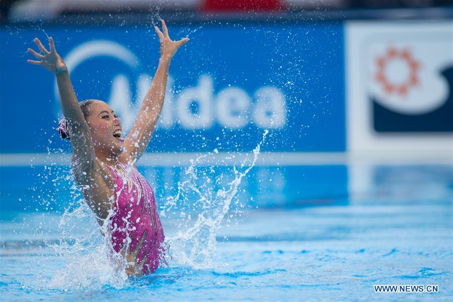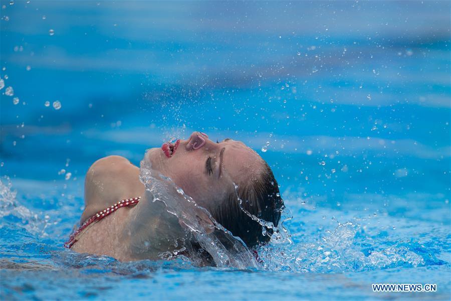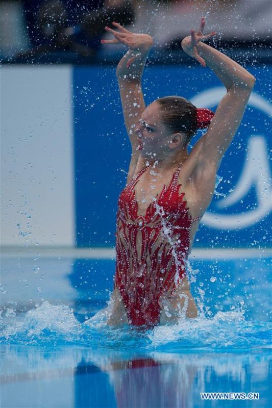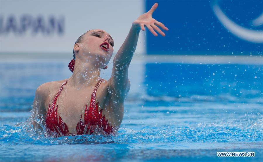 Inui Yukiko of Japan performs during the Solo Synchronized Swimming preliminary of the 17th FINA Aquatics World Championships held in Budapest, Hungary on July 14, 2017. Yukiko Inui finished the solo technical preliminary third with 90.8837 points. (Xinhua/Attila Volgyi)
