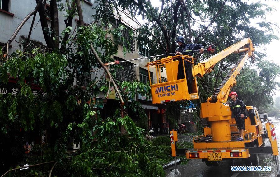 Vessels anchor at port in Haikou, capital of south China's Hainan Province, July 16, 2017. China's national observatory on Sunday renewed a blue alert for typhoon Talas, which is expected to hit Hainan Province and the Beibu Gulf. (Xinhua/Zhao Yingquan)