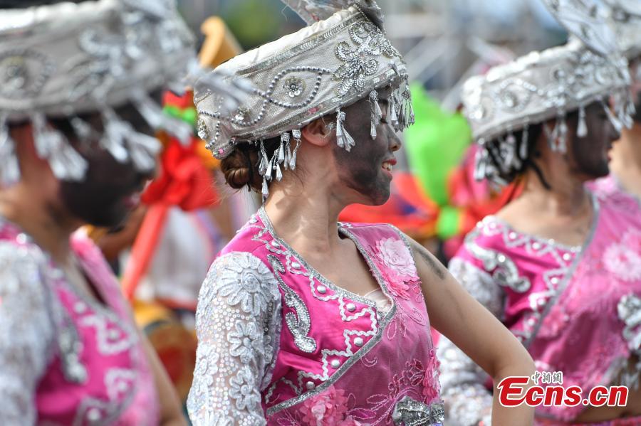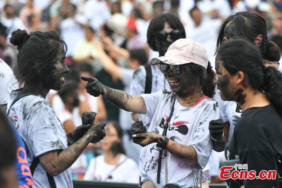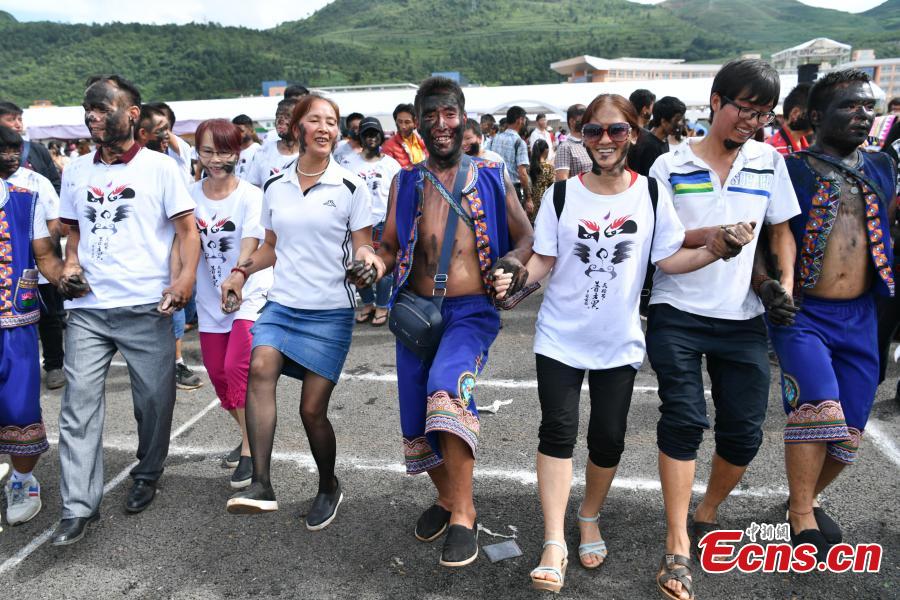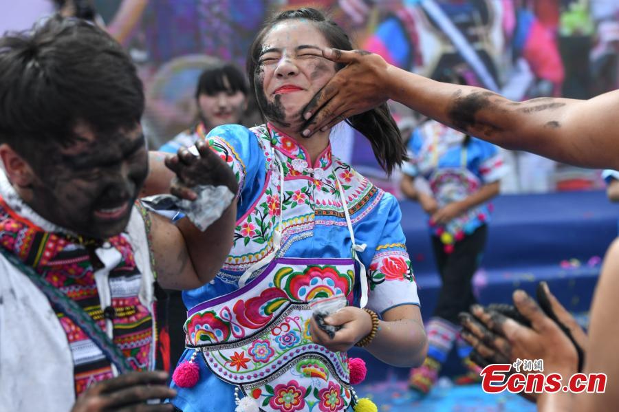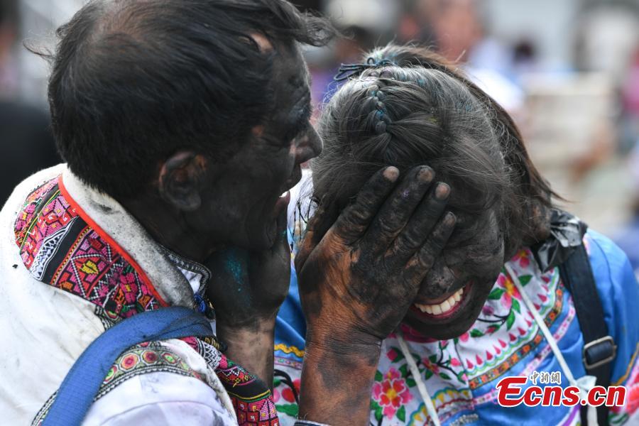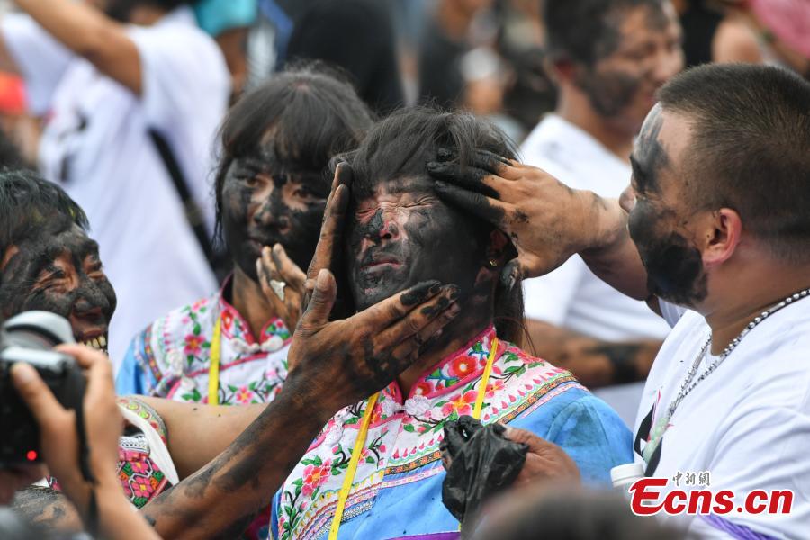 People of the Yi ethnic group and tourists apply black color to each other’s faces during the celebration of a folk festival in Qiubei County, Southwest China’s Yunnan Province, July 18, 2017. As a tradition, people of the local Yi ethnic group turn each other's faces black to express their wishes for good health and happiness during the carnival, which dates back more than 1,000 years. (Photo: China News Service/Ren Dong)