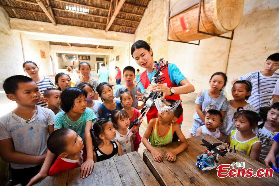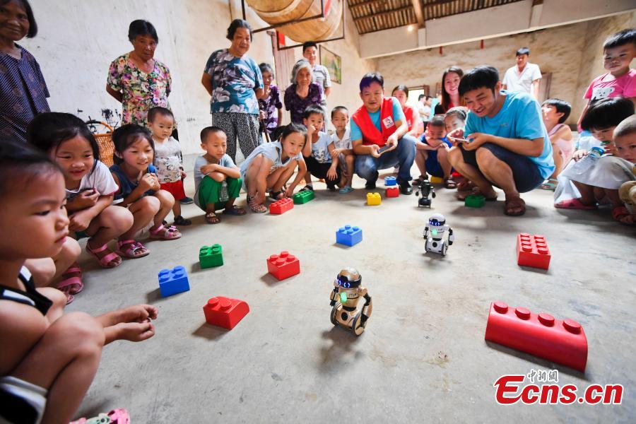 Volunteers play with left-behind children at a village in Xinyu City, East China’s Jiangxi Province, July 19, 2017. Volunteers from the Women's Federation in Xinyu brought voice-controlled robots and other science toys to more than 30 children, and also gave them new stationery school bags. Left-behind children are those in rural areas who live by themselves or with relatives after their parents migrate to work in other cities for better pay. (Photo: China News Service/Zhou Liang)