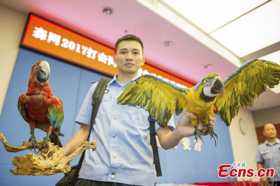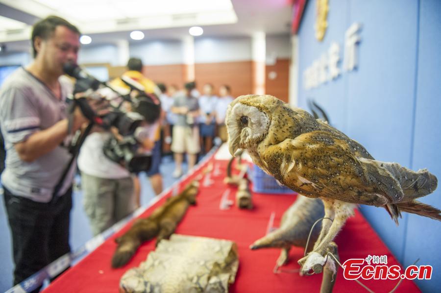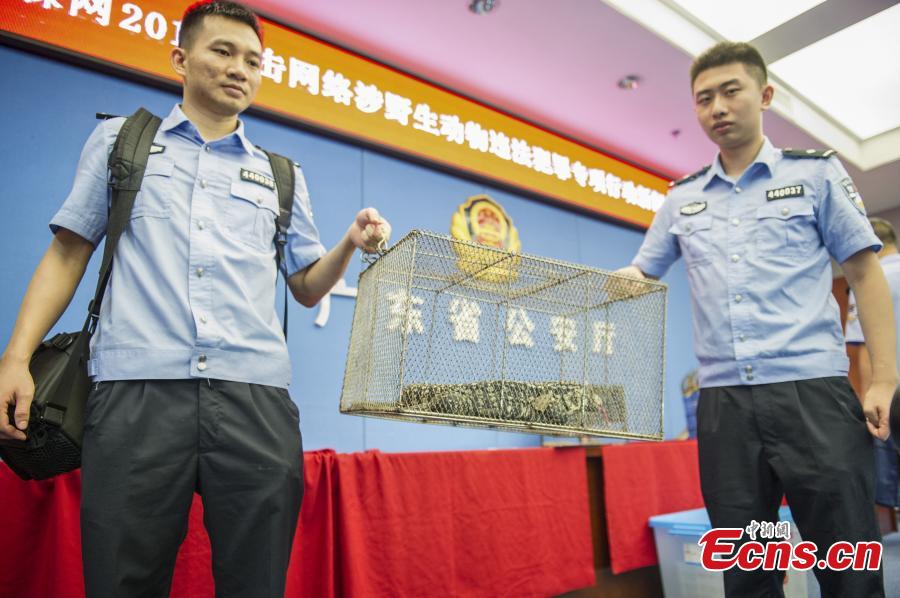 Police officers show products sourced from wild animals seized in raids, with a suspect near-by in handcuffs, in southern Guangdong Province, July 24, 2017. Guangdong police detained 50 suspects, and seized more than 11,720 wild animals and 960 kilograms of wild animal products, with a total market value of 7.5 million yuan ($1.1 million), during raids against online wildlife trafficking from March to June. (Photo provided to China News Service)