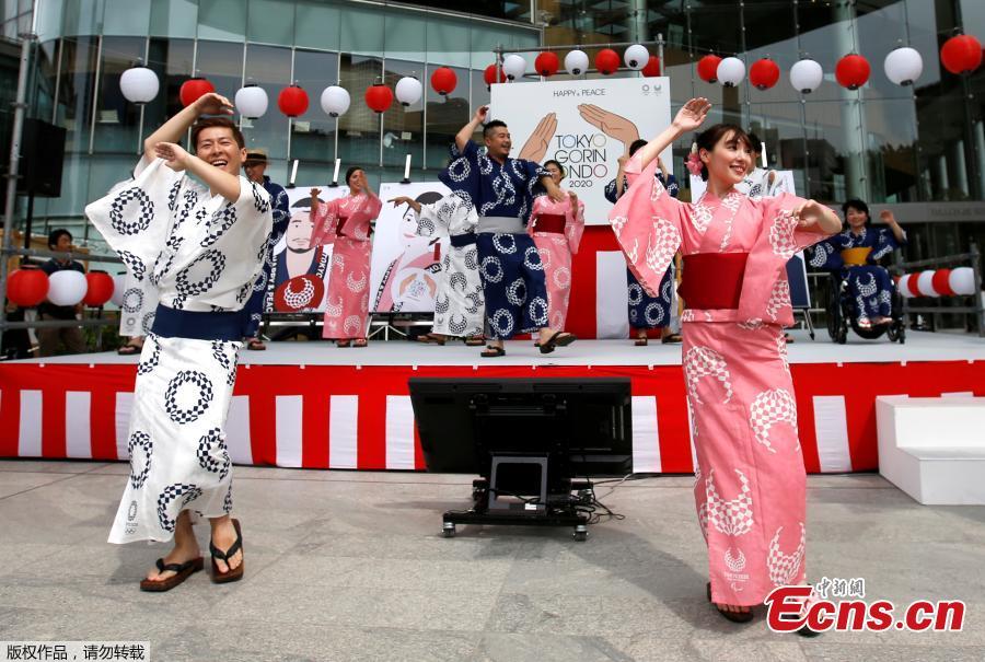 A woman dressed in yukata, or a casual summer kimono, participates in unveiling a new version of the Tokyo 1964 Olympic Games "Tokyo Gorin Ondo", during a ceremony counting down three years to the Tokyo 2020 Summer Olympics, in Tokyo, Japan July 24, 2017.(Photo/Agencies)