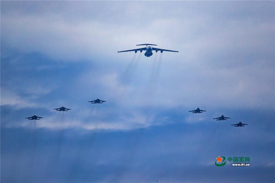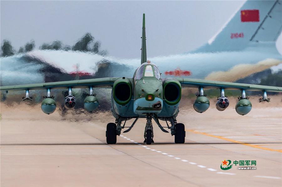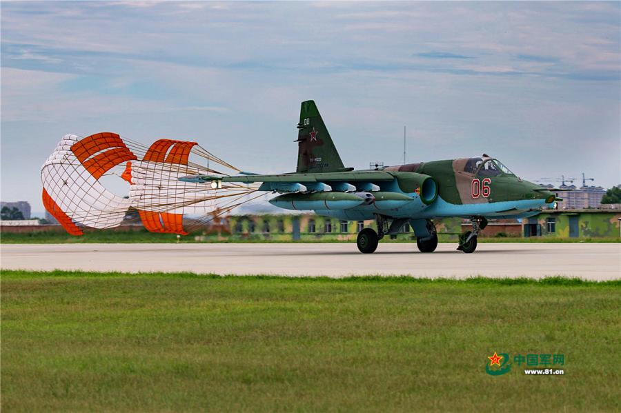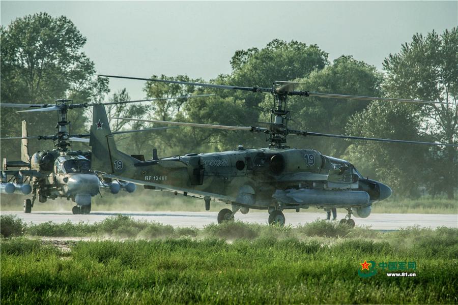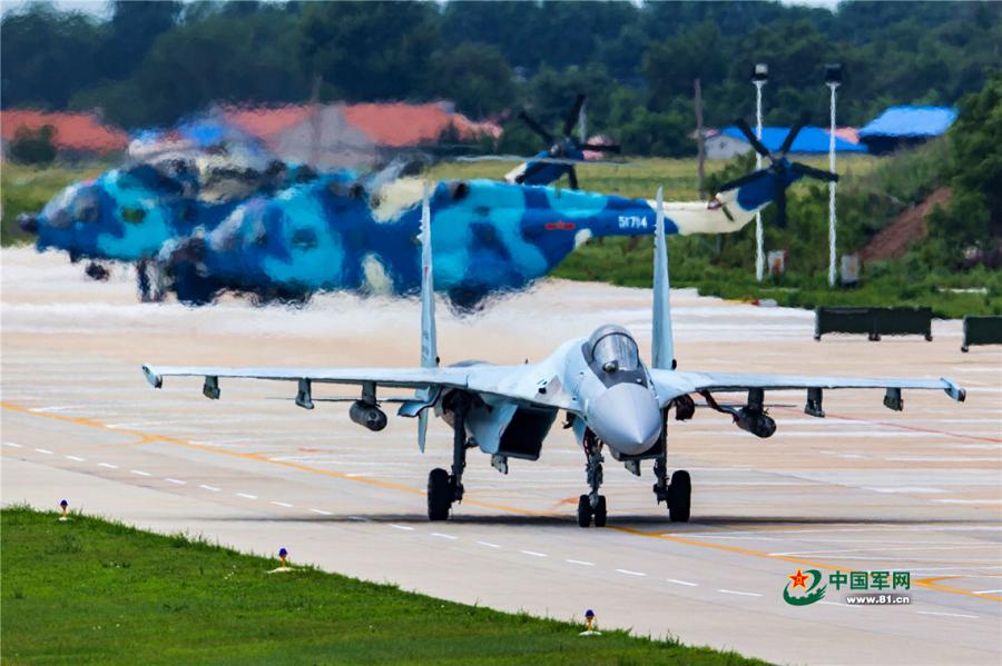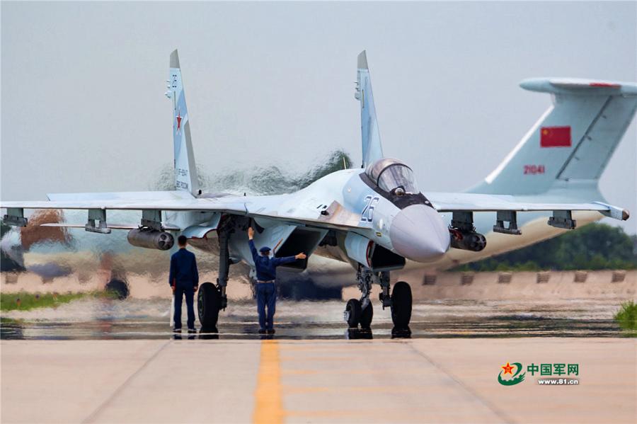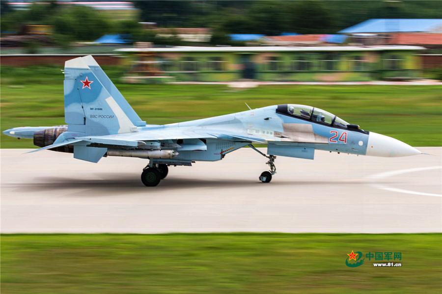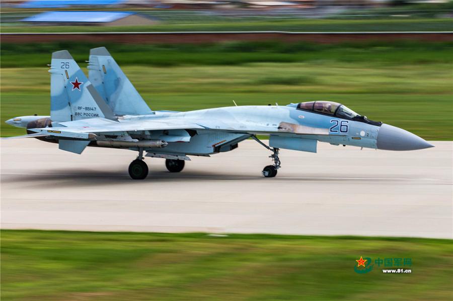 A soldier assigned to the Russian Aerospace Forces signals a Russian SU-35 fighter jet to taxi on the runway at a military airfield in northeast China during a flight training exercise in preparation for the Aviadarts event of the International Army Games (IAG) 2017. (Photo/81.cn)