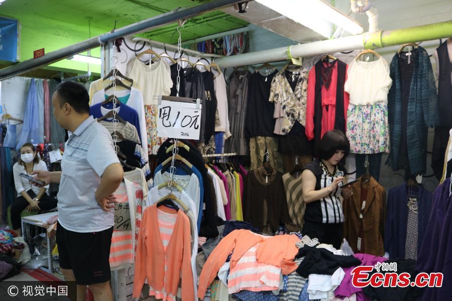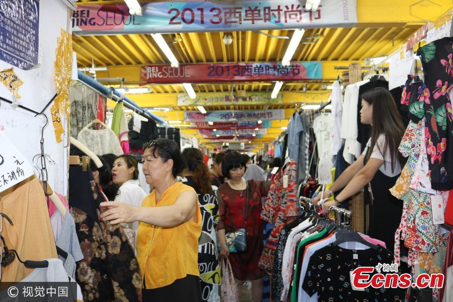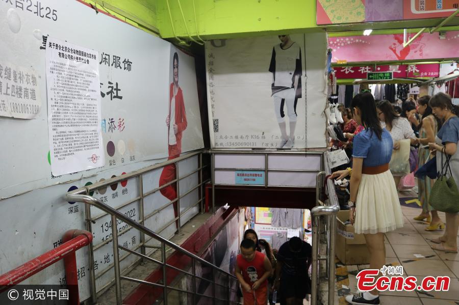 Big sale at Zhonghe wholesale clothing market before its closing in Beijing, July 27, 2017. Zhonghe, a section of the sprawling Beijing Zoo clothing wholesale market, will be closed on July 30 after operating for 18 years, part of a wider push to upgrade Beijing’s urban amenities. Many stall owners are offering discounts to sell off stock. The shutters will close permanently at Beijing Zoo wholesale market by the end of 2017. (Photo/VCG)