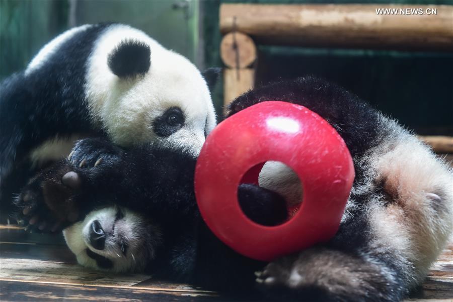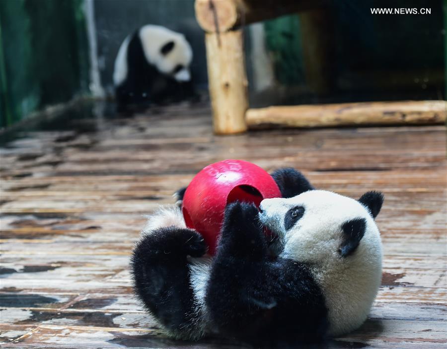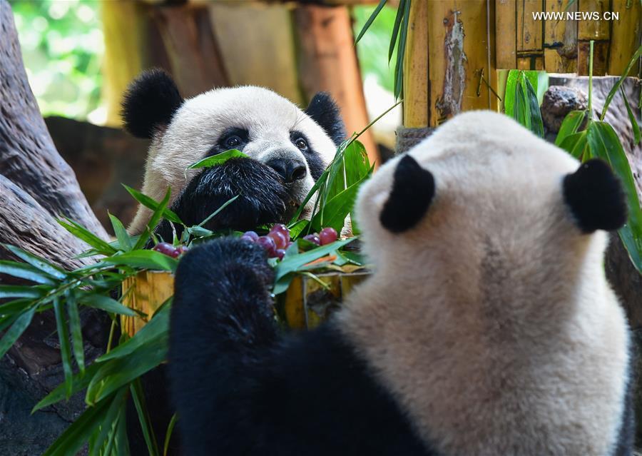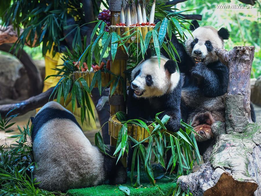 Triplet giant pandas Mengmeng, Shuaishuai and Kuku enjoy food in Chimelong Safari Park in Guangzhou, capital of south China's Guangdong Province July 29, 2017. The triplets celebrated their third birthday Saturday. (Xinhua/Liu Dawei)