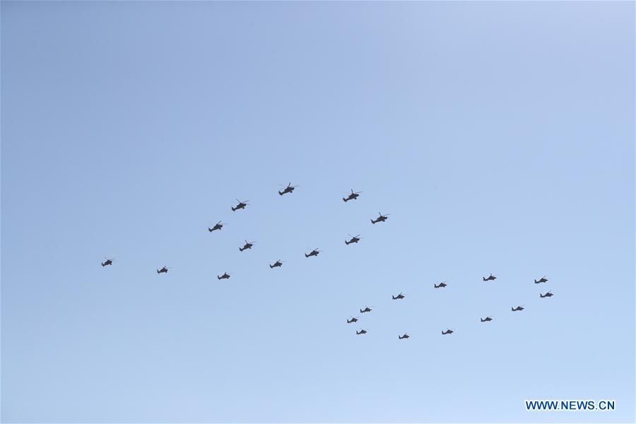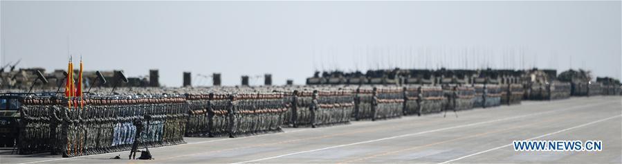 A flag-raising ceremony is held during a military parade celebrating the 90th anniversary of the founding of the Chinese People's Liberation Army (PLA) at Zhurihe training base in north China's Inner Mongolia Autonomous Region, July 30, 2017. Chinese President Xi Jinping, also general secretary of the Communist Party of China Central Committee and chairman of the Central Military Commission, will inspect the troops and deliver an important speech. (Xinhua/Li Gang)