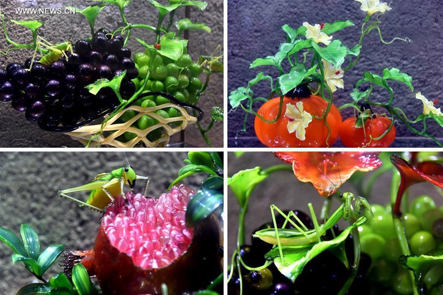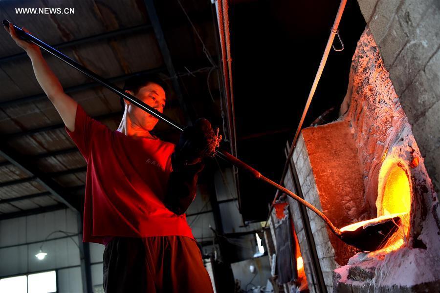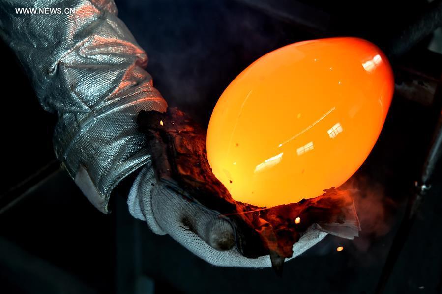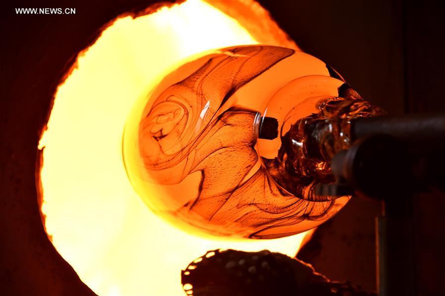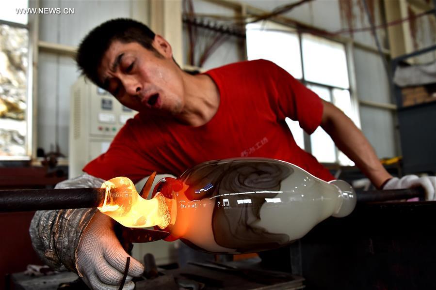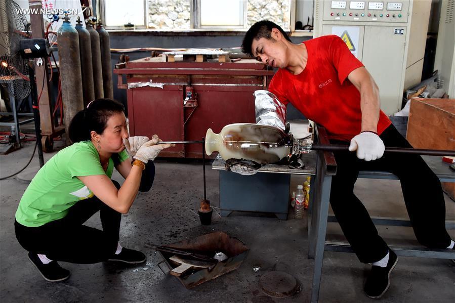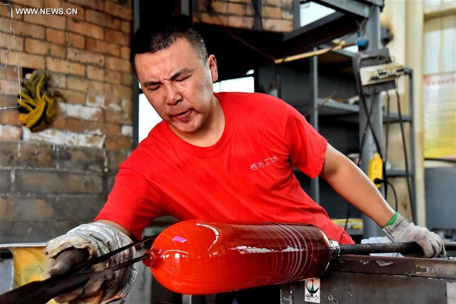A colored glaze maker shows a piece of artwork in a workshop in Boshan District of Zibo City, east China's Shandong Province, July 28, 2017. Zibo, one of the most famous places for the colored glaze products, capable of mass production since Tang Dynasty (618-907AD), is still a key player in the colored glaze market covering more than 100 countries and regions. (Xinhua/Guo Xulei)