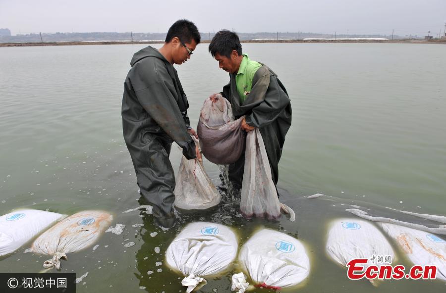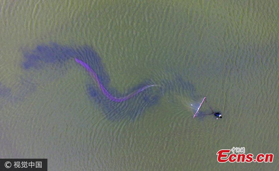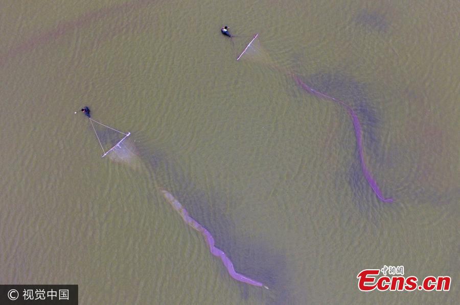 A man fishes for artemia, also known as brine shrimp, by hauling a net in an inland salt lake in Yuncheng City, North China’s Shanxi Province, July 28, 2017. Hundreds of locals catch artemia and sell them to fish farms. (Photo/VCG)