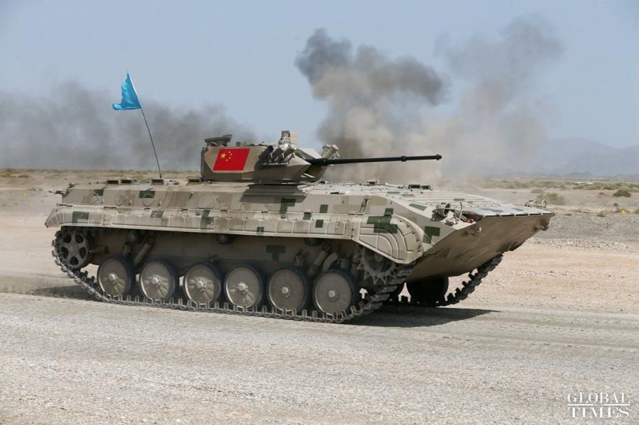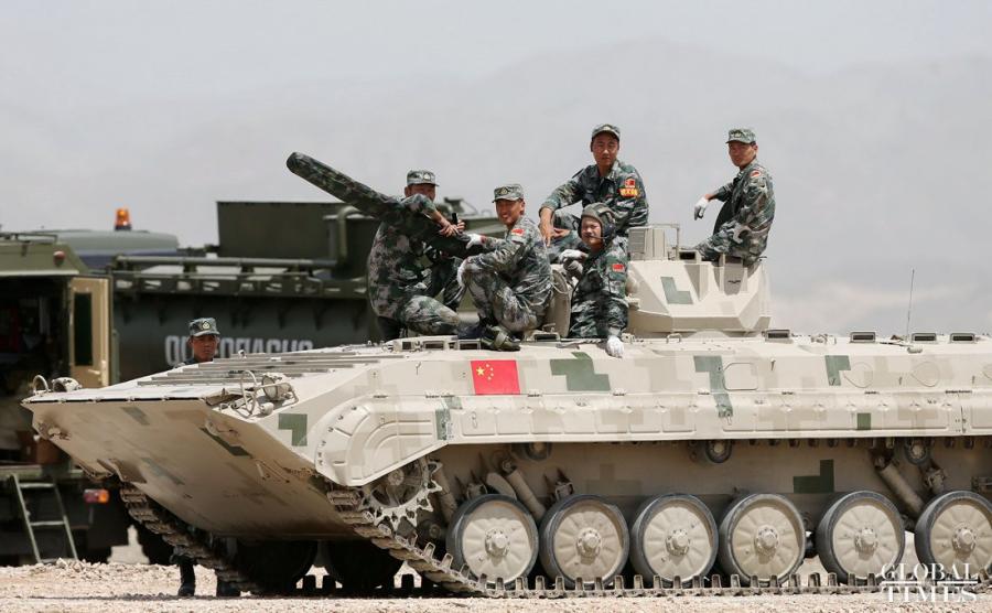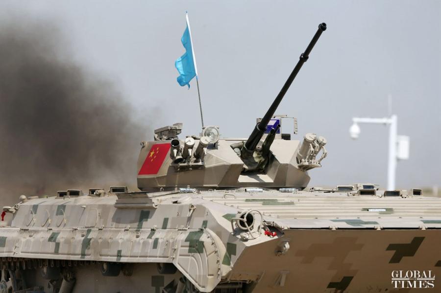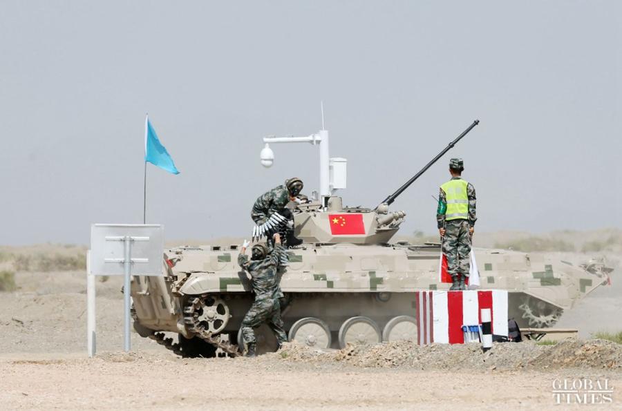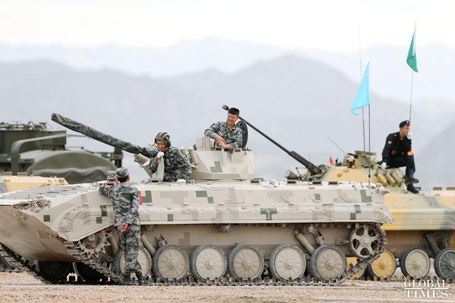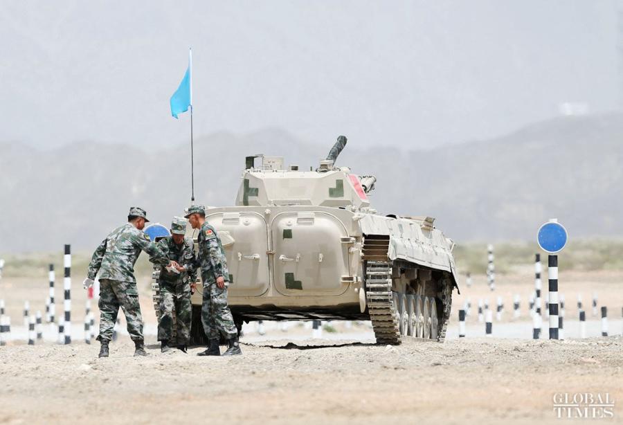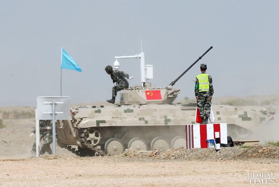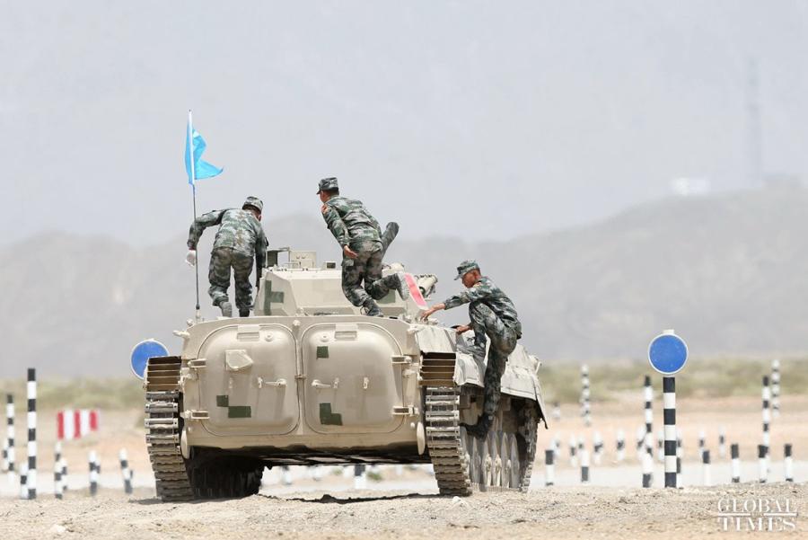 Chinese team takes the lead in Monday's infantry fighting vehicle (IFV) competition, "Suvorov Attack" Individual Race, at the International Army Games 2017 (IAG), hosted by the Chinese PLA Army in Korla, Xinjiang Uyghur Autonomous Region.