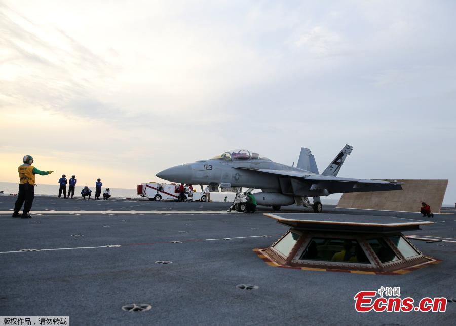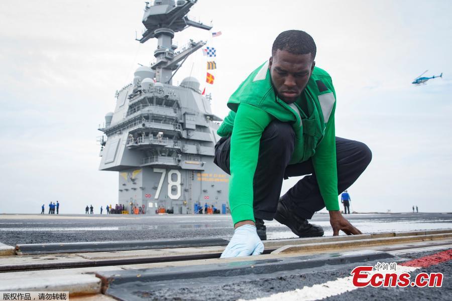 An F/A-18F Super Hornet jet flies over the USS Gerald R. Ford as the U.S. Navy aircraft carrier tests its EMALS magnetic launching system, which replaces the steam catapult, and new AAG arrested landing system in the Atlantic Ocean July 28, 2017. (Photo/Agencies)