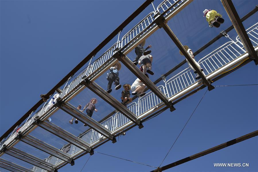 Tourists walk on a glass bridge across the Yellow River in Zhongwei, northwest China's Ningxia Hui Autonomous Region, Aug. 2, 2017. The 210-meter-long glass bridge was modified from an old suspension bridge by replacing the wooden deck with glass. (Xinhua/Li Ran)