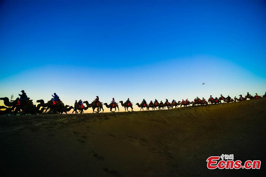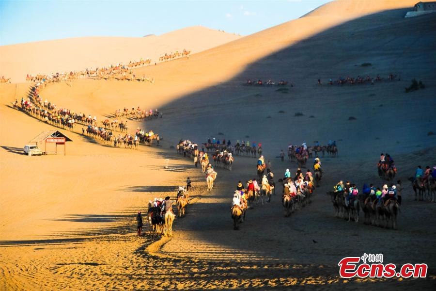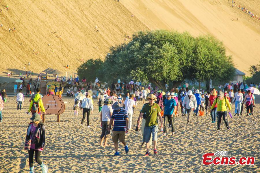 Tourists visit the Crescent Spring and Singing-Sand Dunes scenic spot in Dunhuang City, Northwest China’s Gansu Province. More than 25,000 people visit the tourist attraction each day during the peak summer period. (Photo: China News Service/Wang Binyin)