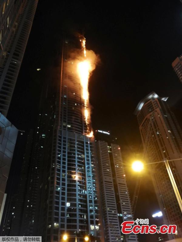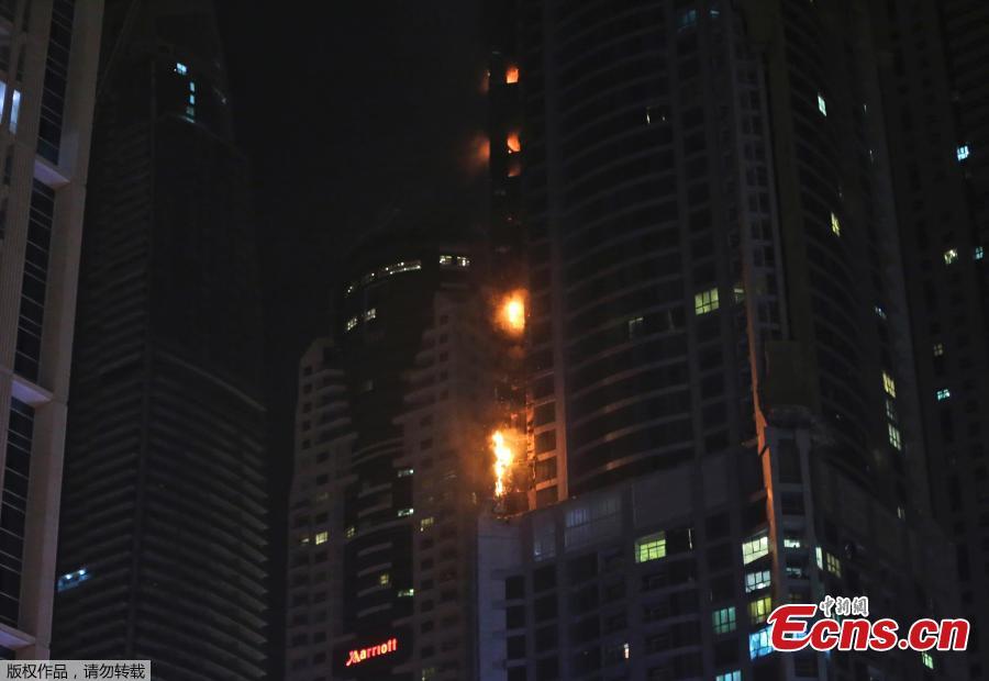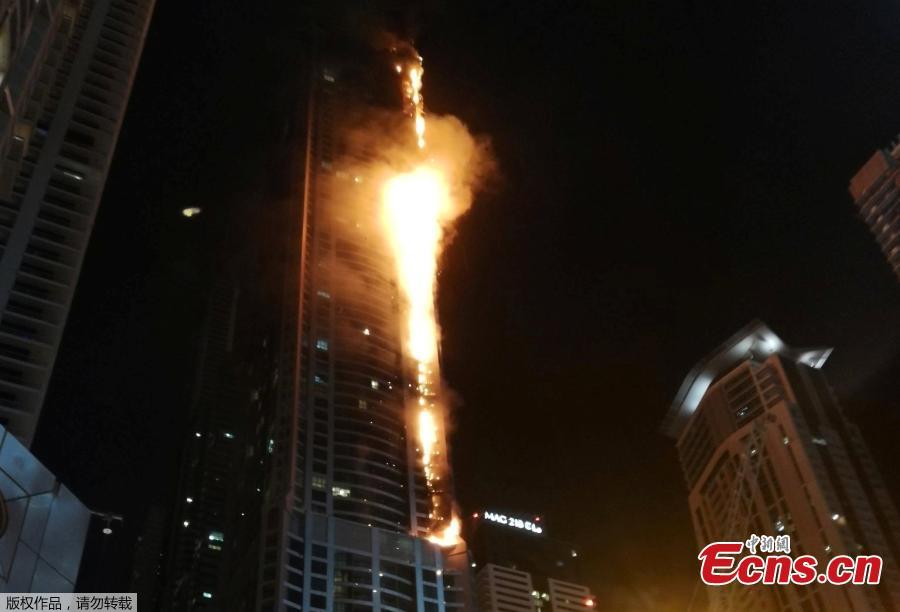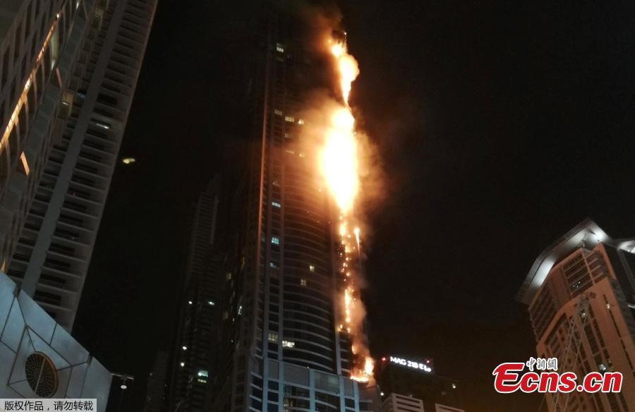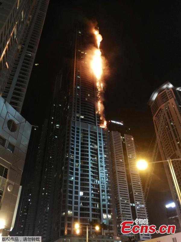 Flames shoot up the sides of the Torch tower residential building in the Marina district, Dubai, United Arab Emirates, in the picture taken on August 4, 2017. Firefighters have extinguished the blaze that swept through one of the world's tallest residential buildings in Dubai early on Friday, forcing occupants to flee their homes as burning debris showered down the sides of the 79-storey tower. Dubai's civil defense authorities said firefighting squads put out the blaze by around 4 am and were cooling the 337 meter tall Torch tower. The tower was evacuated and no injuries were reported, authorities said. (Photo/Agencies)