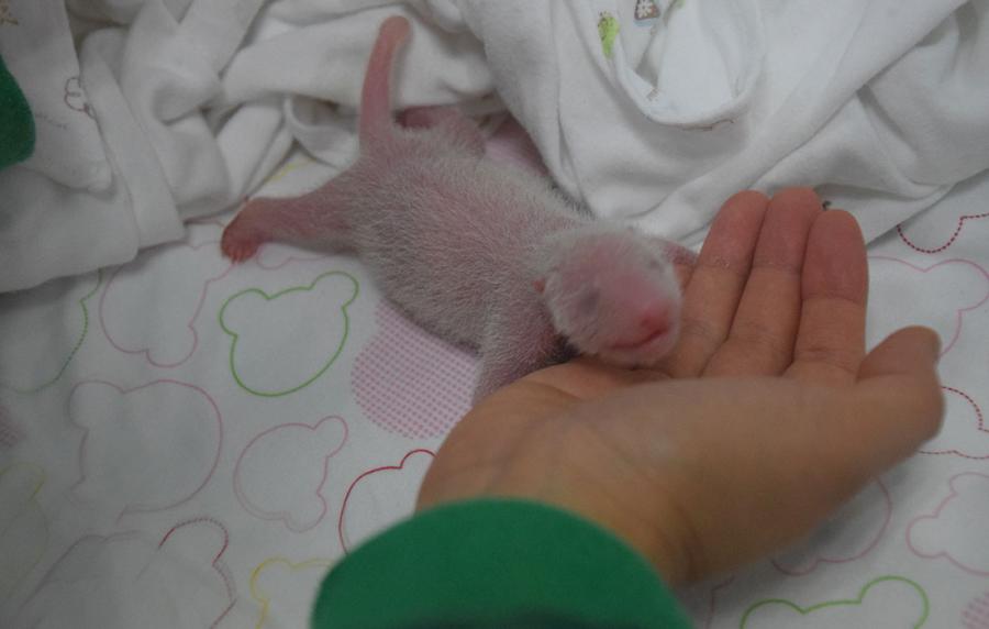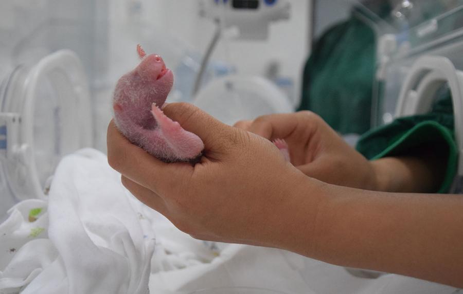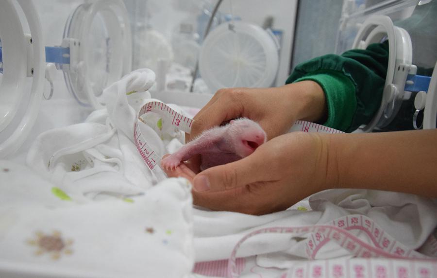 A worker measures the length of the baby panda. (Photo/Courtesy of CCRCGP)