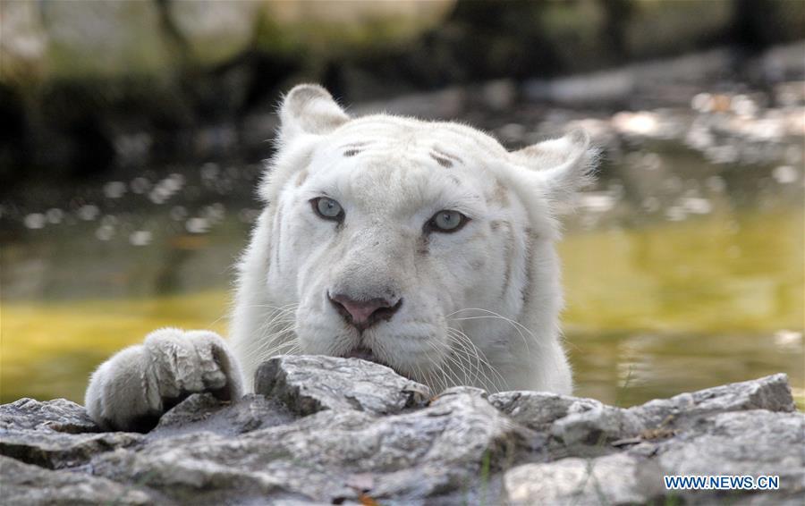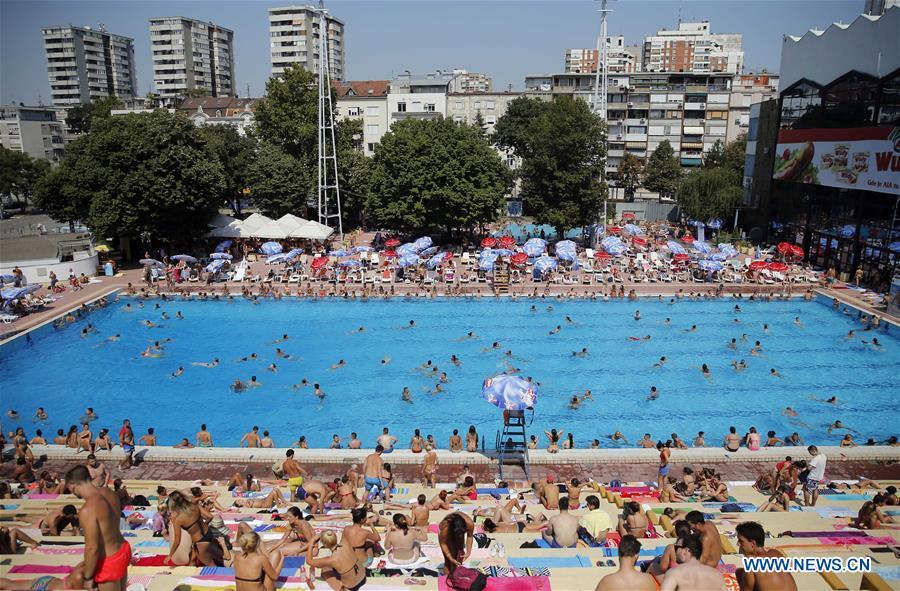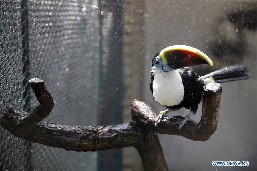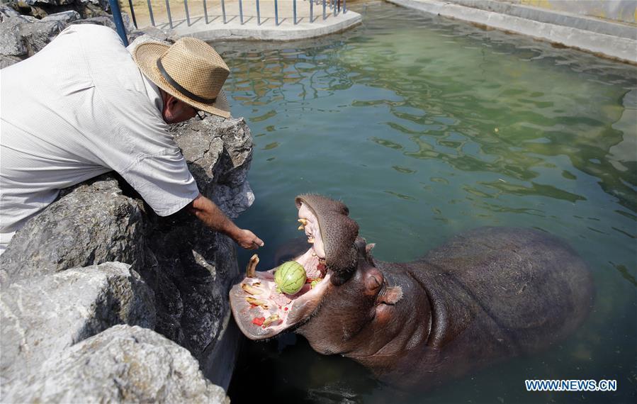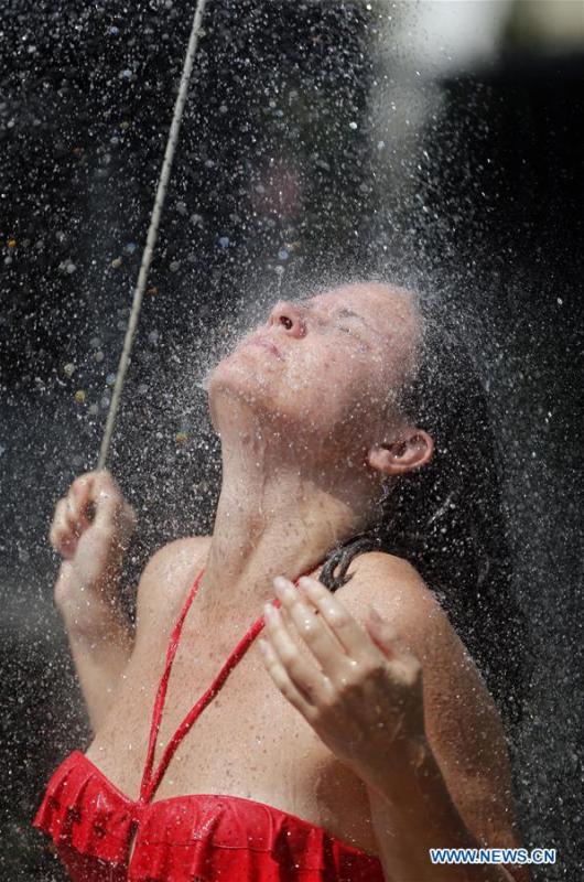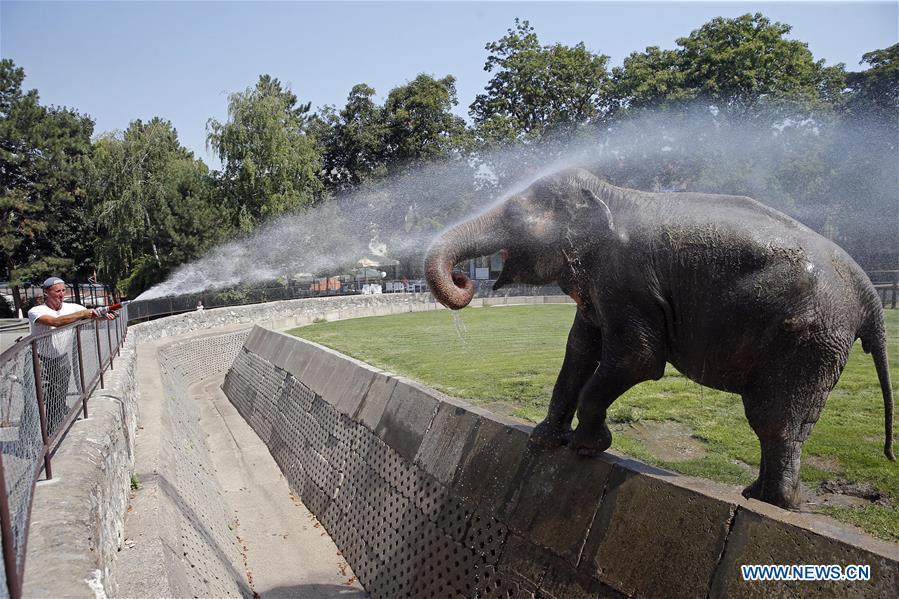 A zoo worker sprays water to a female elephant to cool her down in Belgrade zoo, Serbia, on Aug. 5, 2017. A warning was issued Friday for extreme weather for most of next week across Serbia, with maximum temperatures forecast to range from 37 to 42 degrees Celsius. (Xinhua/Predrag Milosavljevic)