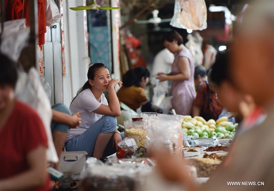 A vendor waits for customers at the No. 8 Market in Xiamen, southeast China's Fujian Province, Aug. 5, 2017. Hundreds of streets and alleys here present the charm of southern Fujian. According to China's Belt and Road Initiative blueprint, Xiamen, the beautiful seaside city, is set to become the strategic pivot city of the 21st Century Maritime Silk Road, and it will hold the ninth BRICS Summit in September. (Xinhua/Song Weiwei)