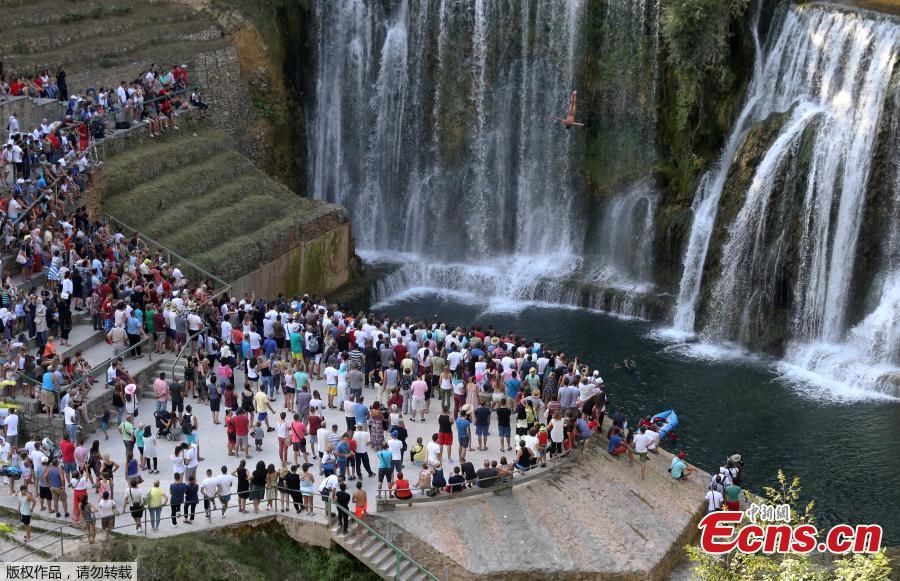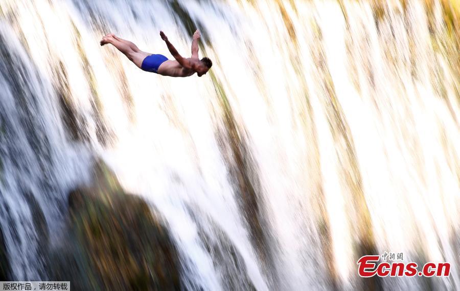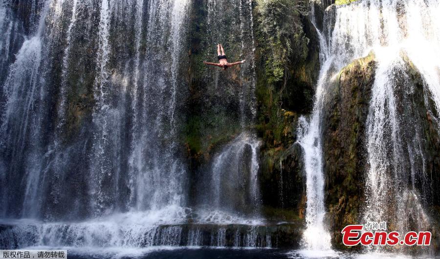 A competitor takes part in the annual international waterfall jumping competition held in the old town of Jajce, Bosnia and Herzegovina, Aug. 5, 2017. (Photo/Agencies)