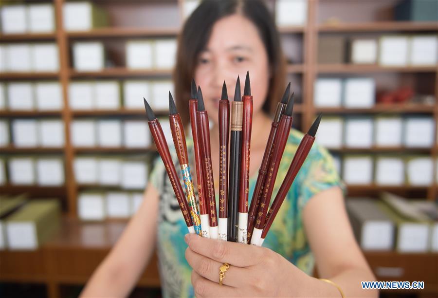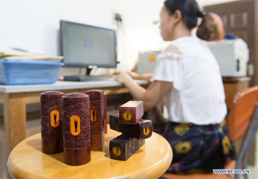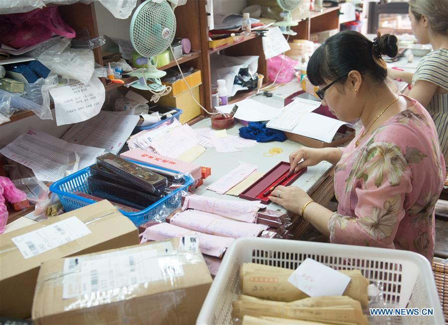 A staff member designs font of ink stampers made with fetal hair in Yongxin Ink Brush Factory in Shanlian Town of Huzhou City, east China's Zhejiang Province, Aug. 8, 2017. Ink brush made of fetal hair became an emerging derivative of traditional hu ink brush industry which attracted a lot of parents to send their children's fetal hair to Shanlian to make customized ink brushes. (Xinhua/Weng Xinyang)