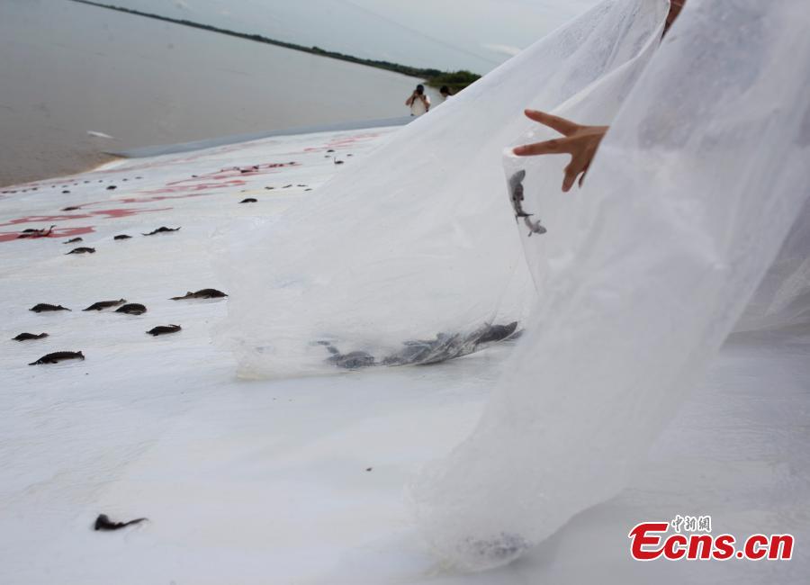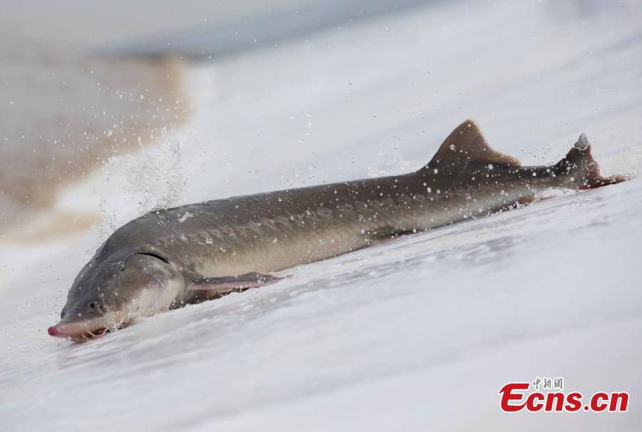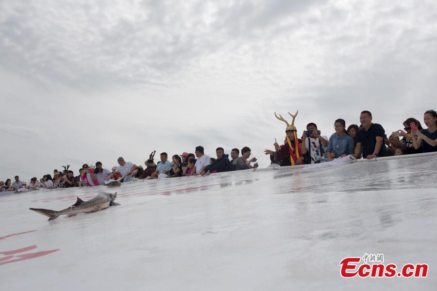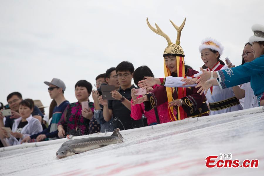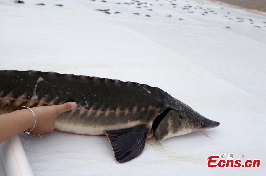 A Kaluga Sturgeon fry is released into the Heilong River in Fuyuan City, Northeast China’s Heilongjiang Province, Aug. 8, 2017. About 100 people participated in the event, releasing some 200,000 Kaluga Sturgeon fry in an attempt to improve fishing conditions. It is claimed the fish are the largest freshwater species in China, and they are mainly found in the Heilong River. They can live for more than 100 years and some have been known to grow to approximately 500 kilograms. (Photo: China News Service/Liu Guanguan)