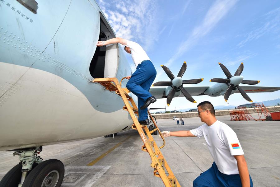 A military transport plane Y-9 prepares to take off for an aerial photography mission over the earthquake-hit region in Southwest China's Sichuan Province on Aug. 9, 2017. The plane took off in western Sichuan around 9:24 a.m. A magnitude-7.0 earthquake struck Jiuzhaigou county, Sichuan province, on Tuesday. (Photo/Provided to chinadaily.com.cn)
