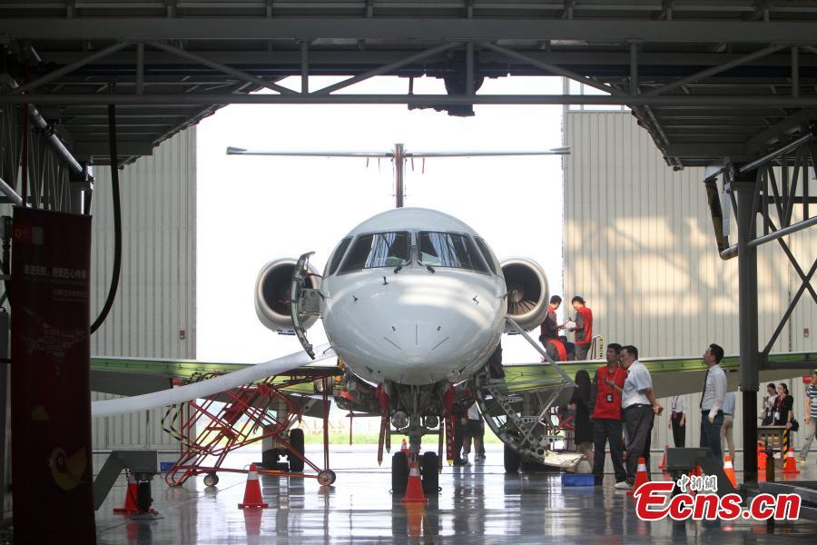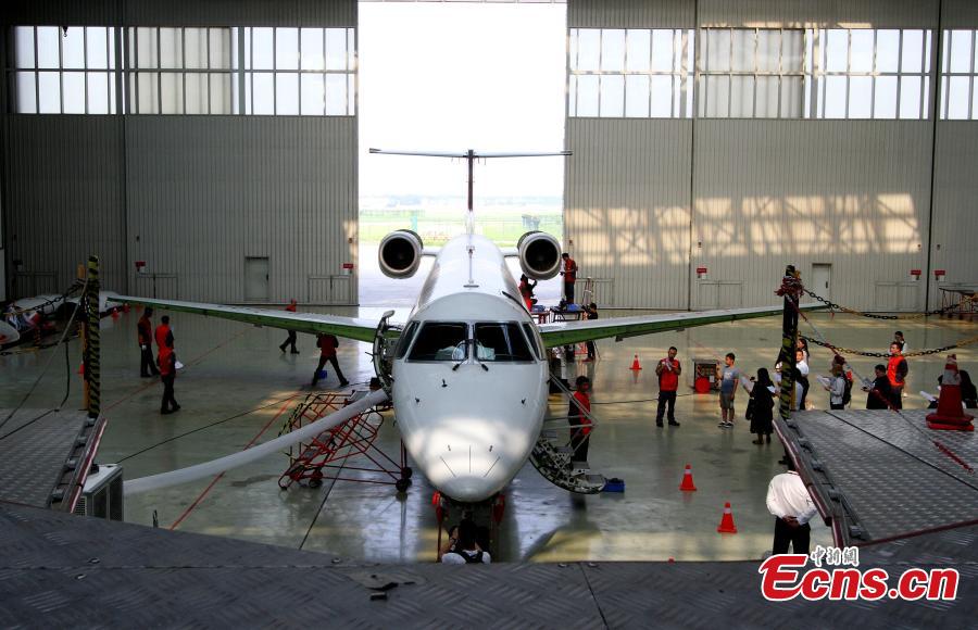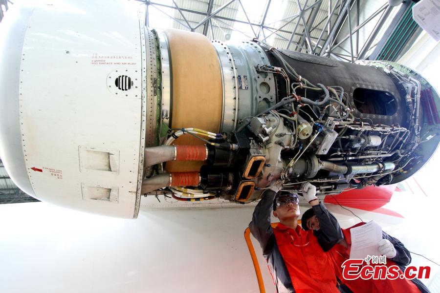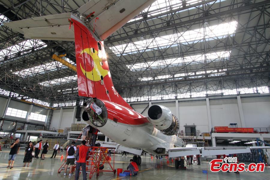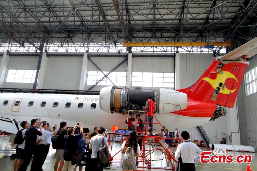 Visitors look as technicians conduct aircraft maintenance at a Tianjin Airlines hangar in North China’s Tianjin Municipality, Aug. 10, 2017. The airline held an open day to let passengers, tourists and aviation enthusiasts better understand aircraft maintenance. (Photo: China News Service/Zhang Daozheng)