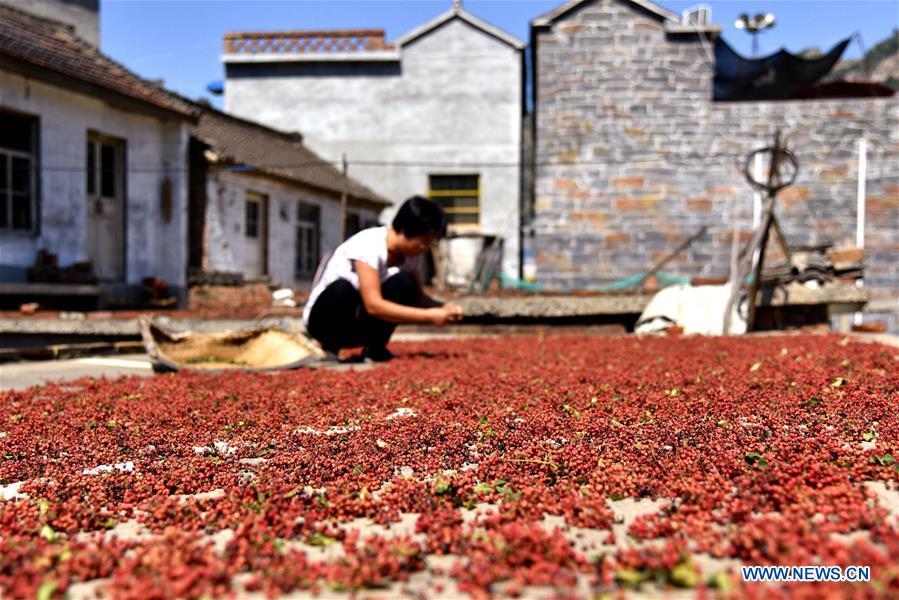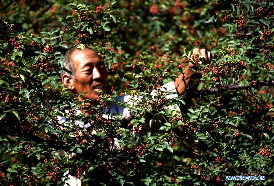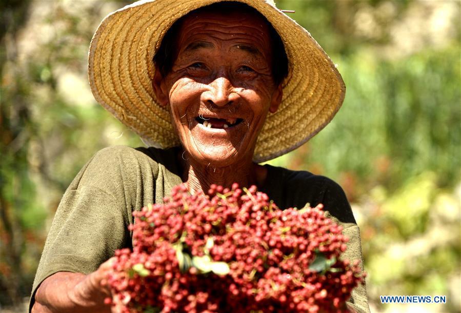 A farmer shows Sichuan peppers picked in Wangjinzhuang Village of Shexian County, north China's Hebei Province, Aug. 13, 2017. Local farmers were busy with picking Sichuan peppers as the harvest season of Sichuan pepper at Shexian County began recently. (Xinhua/Wang Xiao)