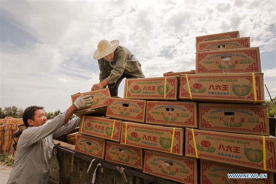 Farmers load Hami melons at Santanghu Town in Kazak Autonomous County of Barkol, northwest China's Xinjiang Uygur Autonomous Region, Aug. 13, 2017. Hami melon, a popular cantaloupe, entered the harvest season here recently. (Xinhua/Polat)
