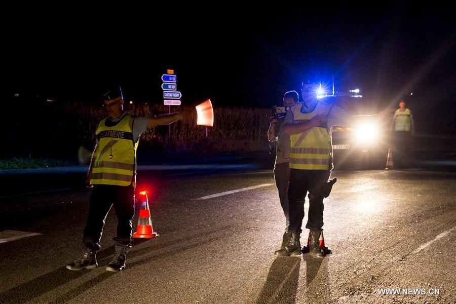 Security forces stand guard near the site where a car crashed into the outdoor terrace of a pizzeria at Sept-Sorts, northeast of Paris, France, on Aug. 14, 2017. A car crashed into the outdoor terrace of a pizzeria at Sept-Sorts, 60 km northeast of Paris, on Monday evening, killing a 13-year-girl and injuring at least 12 others, a spokesperson of France's Ministry of Interior told local media. (Xinhua/Thel Duval)