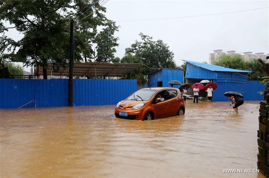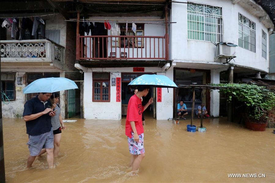 Photo taken on Aug. 14, 2017 shows the waterlogged riverbank in Rongan County of Liuzhou City, south China's Guangxi Zhuang Autonomous Region. Heavy rain hit Rongan County and raised the water level of Rongjiang River Monday, which resulted in waterlogging here. (Xinhua/Tan Kaixing)