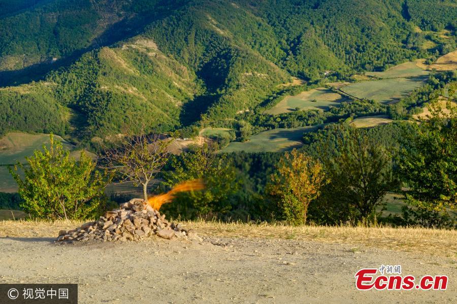 A group of tourists look the volcano's flame coming out from the subsoil in Forli, Italy, Aug. 14, 2017. The volcano of Monte Busca is the smallest in Italy and is in the Province of Forli near Tredozio village. The flames are due to the release of hydrocarbon gases which in contact with oxygen creates a flame. The phenomenon is also known as 'flaming fountain'. (Photo/Agencies)
