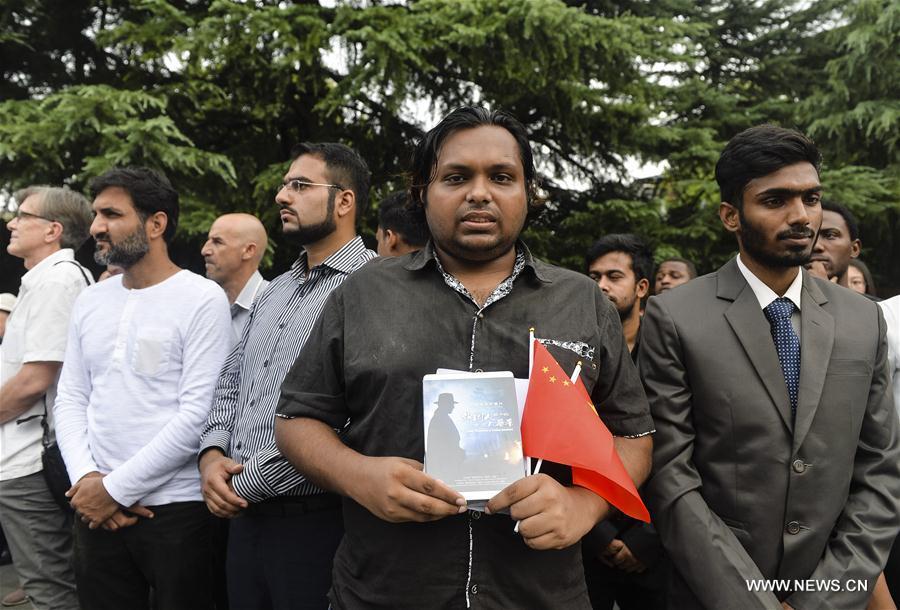 Members of an anti-war NGO based in Kobe, Japan attend a peace assembly at the Memorial Hall of the Victims in Nanjing Massacre by Japanese Invaders in Nanjing, capital of east China's Jiangsu Province, Aug. 15, 2017. Representatives from countries such as China, Japan, Pakistan, Bangladesh and Jordan attended the assembly to commemorate the 72nd anniversary of Japan's unconditional surrender in World War II. (Xinhua/Ji Chunpeng)