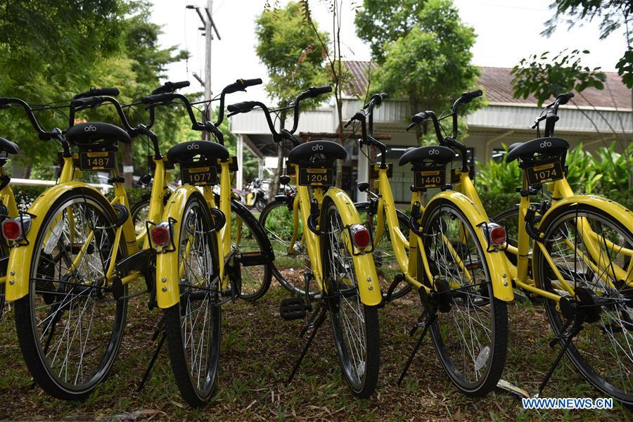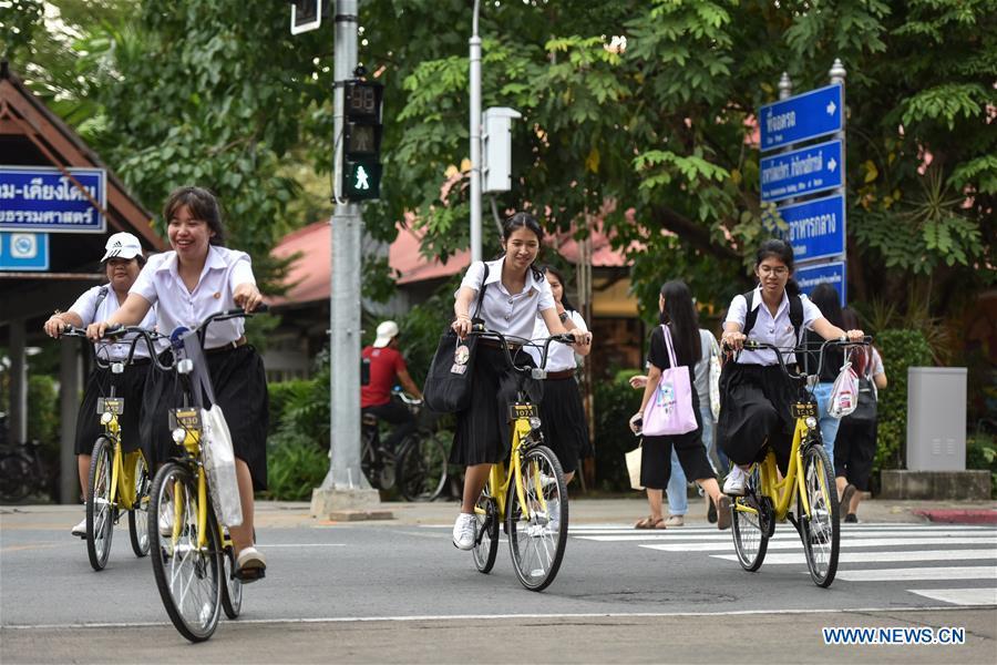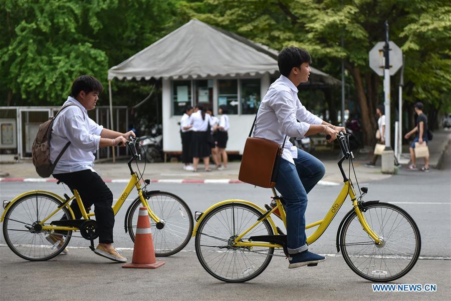 Students ride ofo bikes at Thammasat University in Bangkok, Thailand, Aug. 15, 2017. China's leading bike-sharing company ofo plans to invest a total of 6,000 bikes in major universities in Thailand. (Xinhua/Li Mangmang)