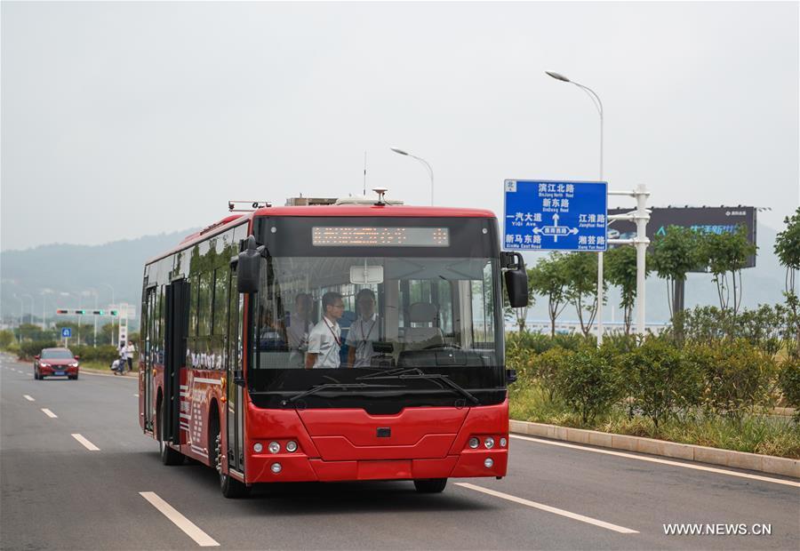 Photo taken on Aug. 15, 2017 shows a 12-meter-long electric smart bus making a turn at the intersection during a road test in Zhuzhou, central China's Hunan Province. Chinese rail maker CRRC announced it has developed a 12-meter-long electric smart bus on July 18, with a top speed of 40 kilometers per hour. (Xinhua/Shen Hong)