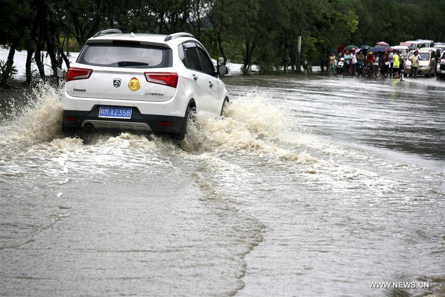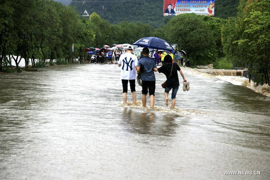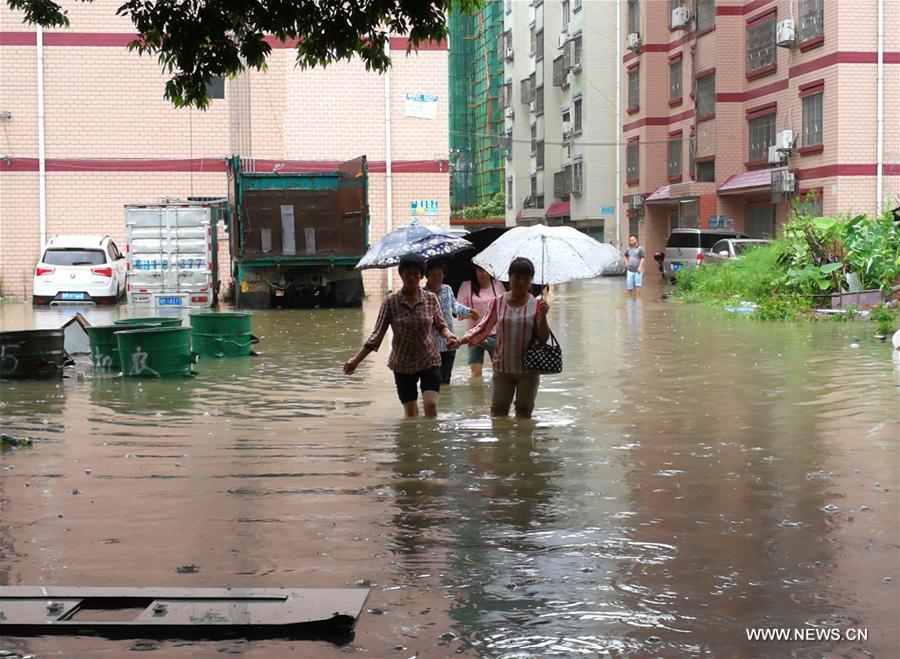 Residents wade in the flood water in Luocheng County of south China's Guangxi Zhuang Autonomous Region Aug. 15, 2017. A torrential rain struck the county causing disruption to transportation. (Xinhua/Liao Guangfu)