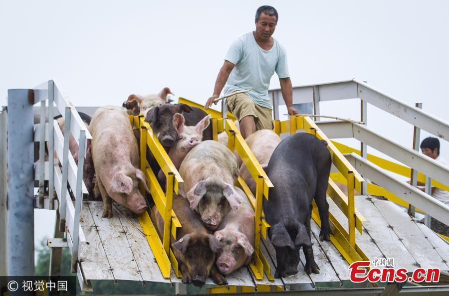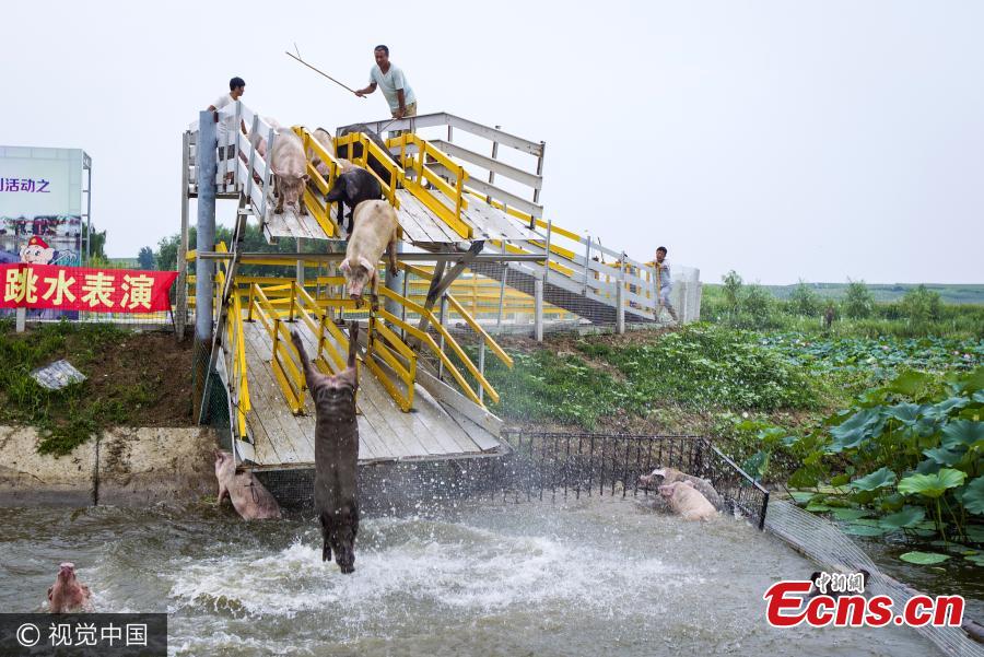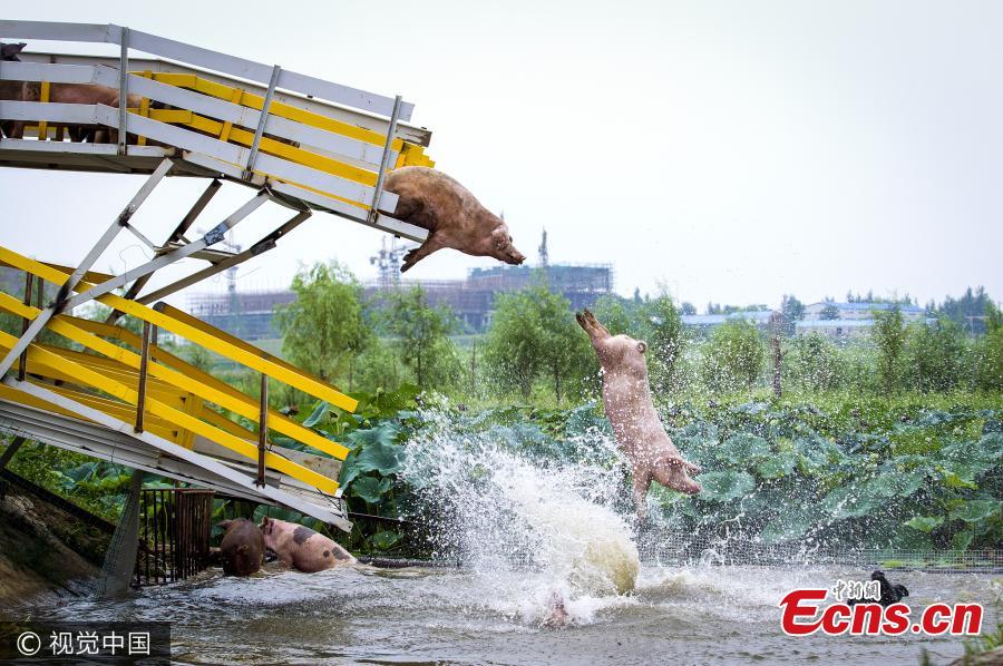 Pigs are driven to jump into the water at a pig farm in Shenyang City, Northeast China’s Liaoning Province. Keepers routinely drive pigs to jump from two platforms, either one meter or three meters high, into the pond as a method to improve pork quality. Keepers say the water is more than three meters deep and safe for the pigs’ dive. (Photo/VCG)