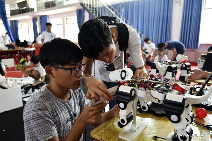 Contestants compete at China robot competition in Rizhao City, east China's Shandong Province, Aug. 16, 2017. A total of 3,450 contestants from 210 universities participated in the contest.(Xinhua/Lu Jie)