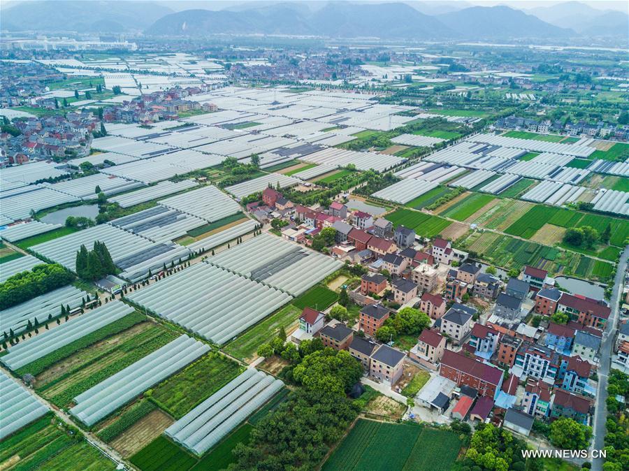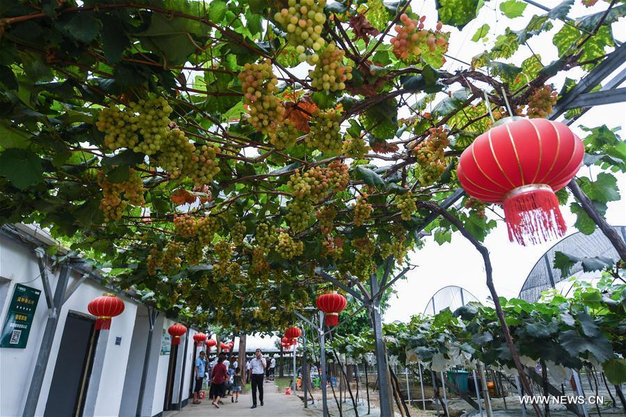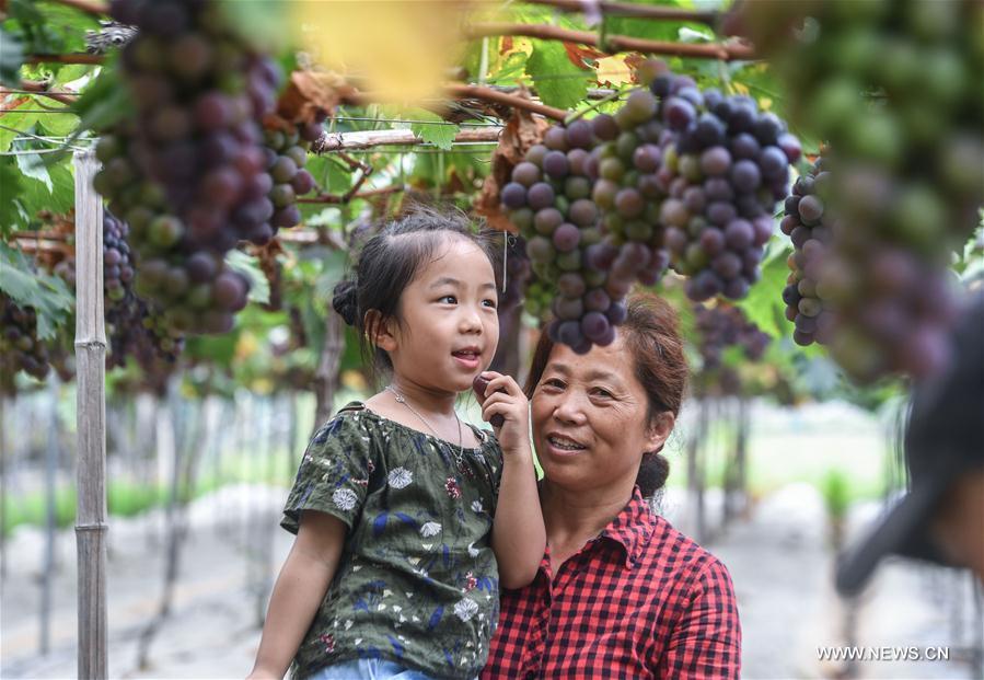 People pick grapes at a grape cooperative in Lujiapu Village of Fuyang District in Hangzhou, capital of east China's Zhejiang Province, Aug. 17, 2017. Fuyang has strived in developing its rural tourism industry in the past two years. (Xinhua/Xu Yu)