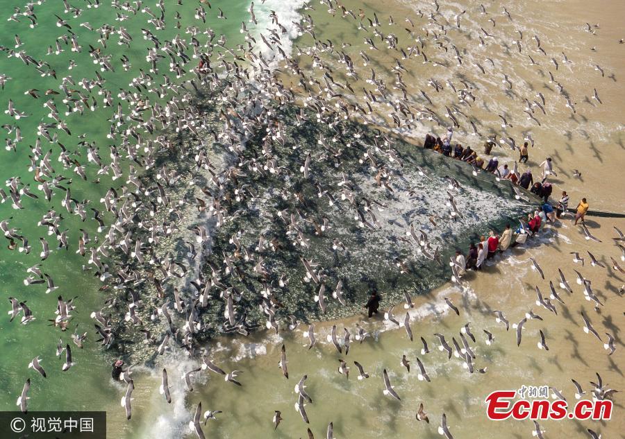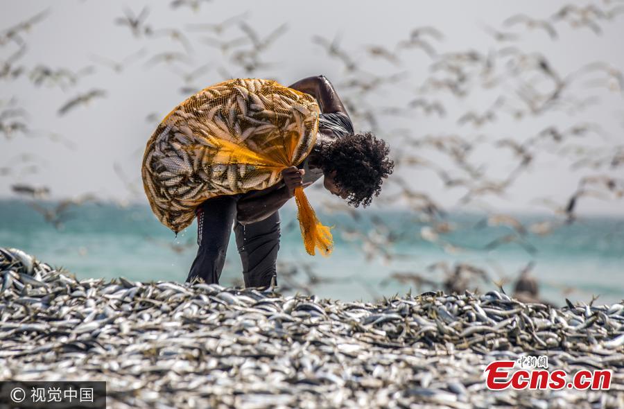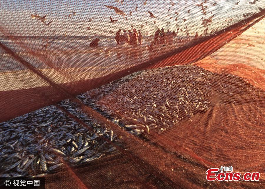 Teams of fisherman gathered together for the catch of the day as thousands of sardines migrated from the Indian Ocean to the African coast earlier this year. Photographer Ahmed Mohamed Al Toqi captured the series of breathtaking images in Dhofar during the sardine migration in February, after spending many early mornings with the fishermen. Once the sardines are spotted and located by fishermen, an encircling net called 'Thagiya' is thrown into the water by the captain boat and the other end of the net is given to the assistant boat. The two ends of the nets are given to the teams on the beach who haul the net using their hands and use the help of a truck to hold the sardines. (Photo/VCG)