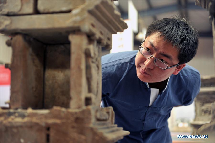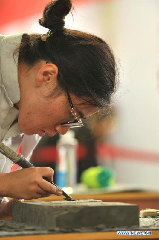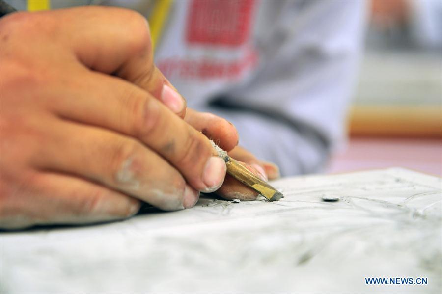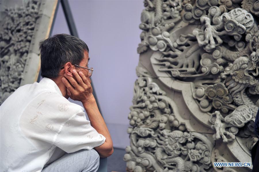 A visitor looks at a piece of brick carving work during a brick carving contest in Linxia Hui Autonomous Prefecture of northwest China's Gansu Province, Aug. 17, 2017. A total of 72 competitors from all over China participate in the event. (Xinhua/Guo Gang)