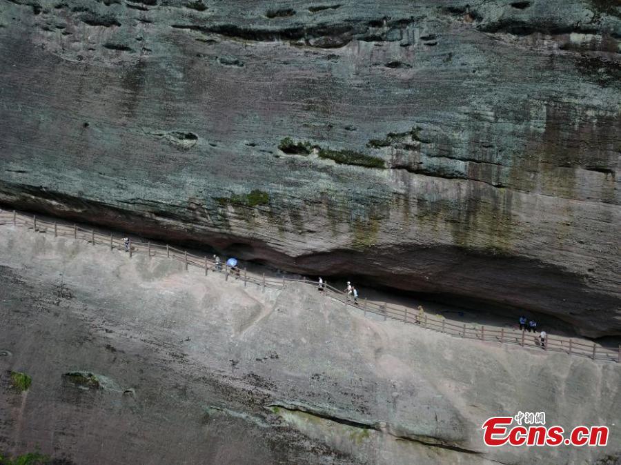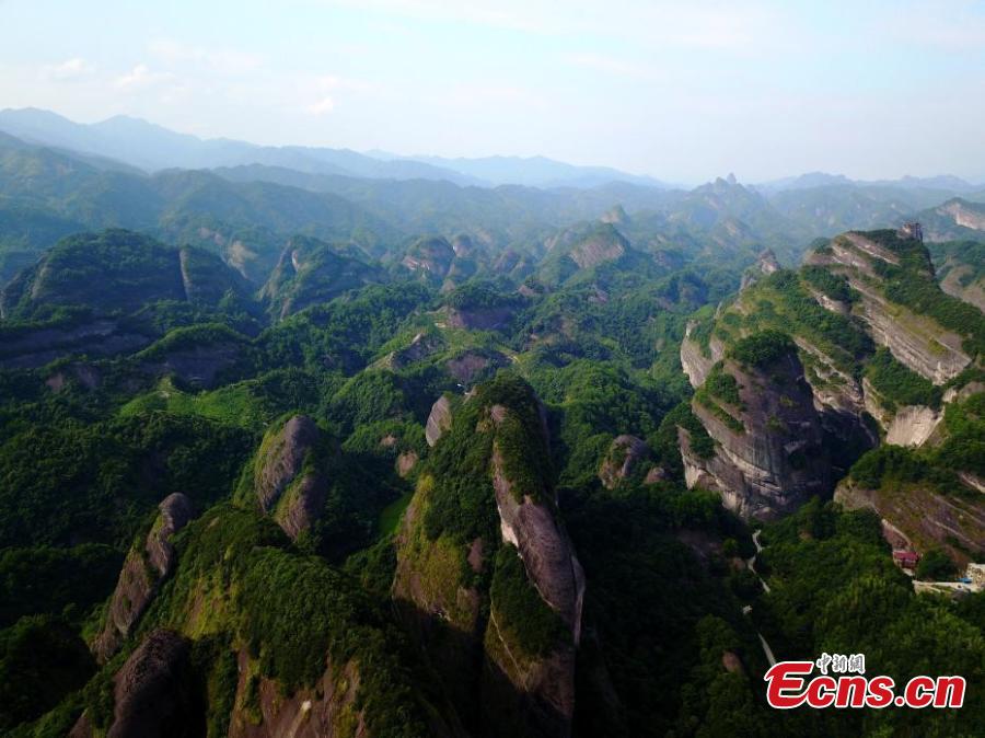 A bird’s eye view of Danxia rock formations at the Bajiaozhai Scenic Spot in Ziyuan County of Guilin, south China's Guangxi Zhuang Autonomous Region. Danxia describes a unique type of geological formation found only in China, caused by erosion, and having the appearance of "rosy clouds." Photo taken on August 19.(Photo: China News Service/Yu Jing)