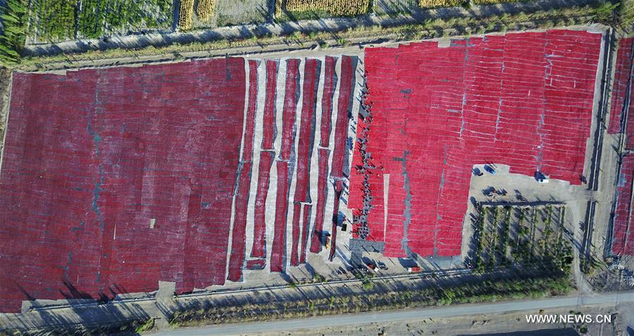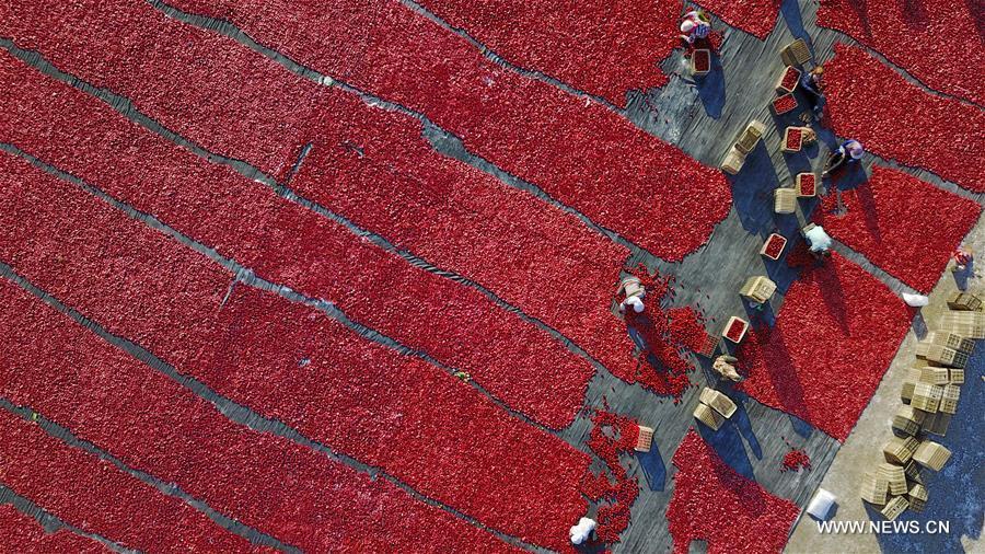 Villagers put tomatoes under the sun to dry them in Hejing County of Mongolian Autonomous Prefecture of Bayingolin, northwest China's Xinjiang Uygur Autonomous Region, Aug. 20, 2017. The prefecture, with more than 20,000 hectares of tomato field, is a producing base for the sun dried tomatoes for the Korean, Australian, UK and USA market. (Xinhua/Que Hure)
