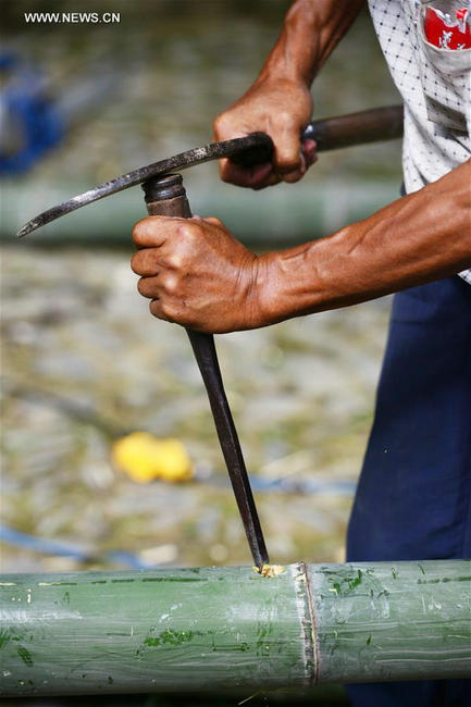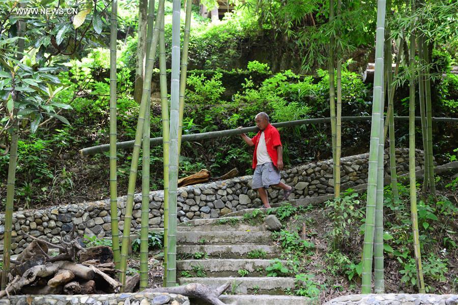 Yang Mingqing, 72, assembles a bamboo raft in Fanzhao Village of Nanshao Town in Jianhe County, southwest China's Guizhou Province, Aug. 19, 2017. The brothers, makers of the bamboo raft for several decades, saw its vanish years ago as the new transportation took the lead in the daily life, but they are demanded now to revive the old crafts. In recent years, local tourism industry booms with more tourists curious about the traditional local life including the rafting as the old fashioned transport. (Xinhua/Yang Wenbin)