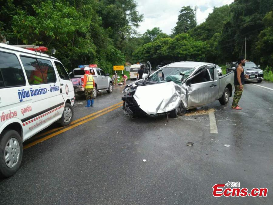 Chinese tourists injured in a car accident are rushed to hospital in Chiang Mai, Thailand, Aug. 20, 2017. The accident left 11 Chinese tourists injured, including five in critical condition. (Photo provided by The Chinese Consulate General in Chiang Mai)
