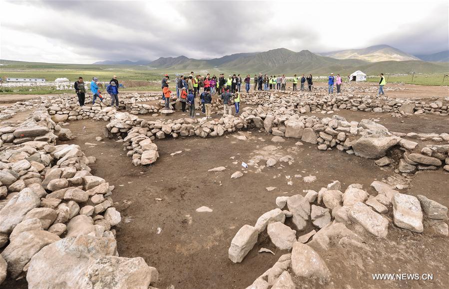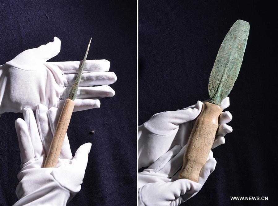 A stoneware unearthed from a settlement is seen in Wenquan County, northwest China's Xinjiang Uygur Autonomous Region, Aug. 20, 2017. More than 50 experts from State Administration of Cultural Heritage, the Institute of Archaeology of the China Academy of Social Sciences and Peking University attended a symposium in Wenquan county, recognizing that the settlement consisting of tombs and ruins of residential structures dates back to 3600 years ago. Items and structure ruins unearthed in the settlement since 2016 offered important value for people to learn about the history and culture of the Bronze Age . (Xinhua/Li He)