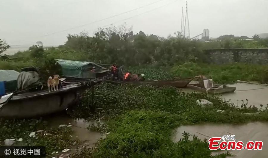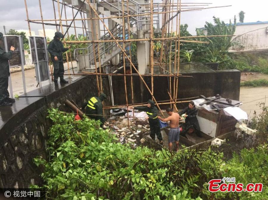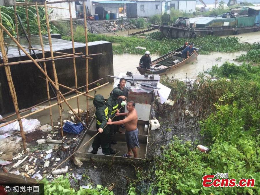 Border soldiers evacuate fishermen to safety as typhoon Hato makes landfall in the city of Zhuhai in Guangdong Province, Aug. 23, 2017. One fisherman was drunk and stayed on his boat. However, his barking dog helped rescuers find him and move him to a safe place. At least nine people have been killed and one remains missing as the strongest typhoon of the year hit south China. (Photo/VCG)